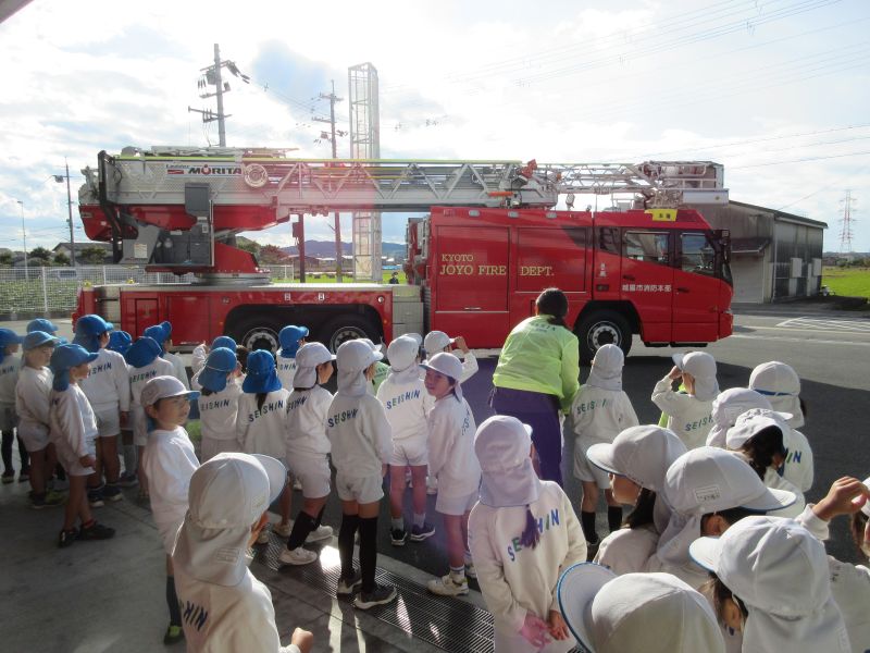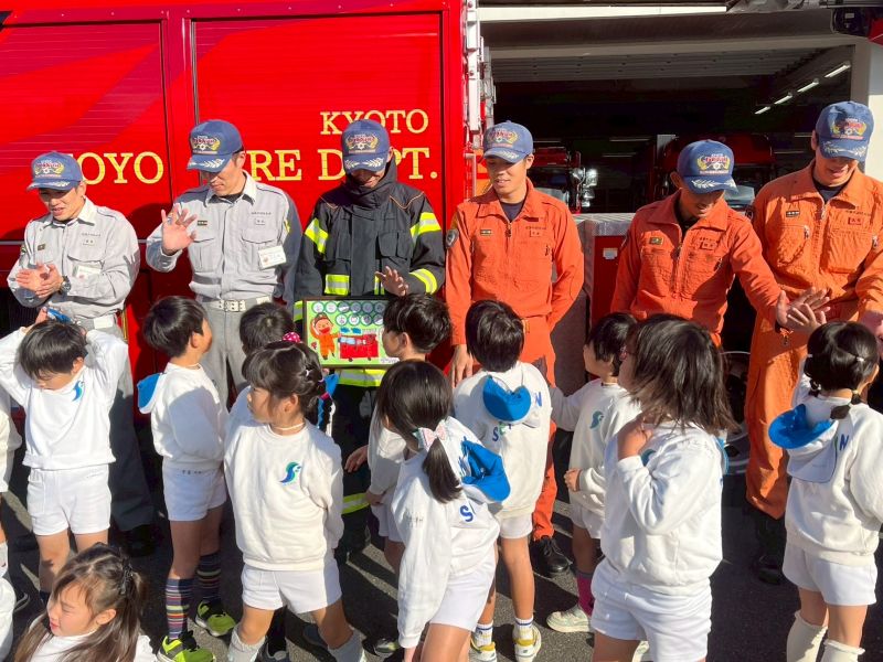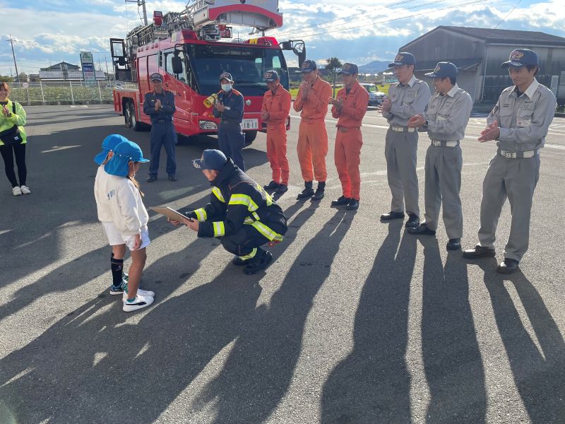 最後には、消防士さん、救急隊の方が出てきてくださり「いつも守ってくれてありがとう」と勤労感謝の日によせて作ったカードを渡しました。