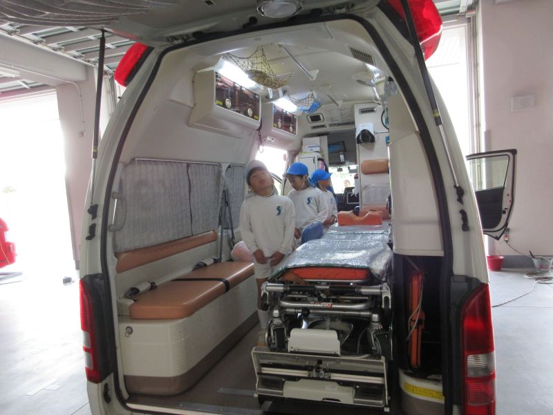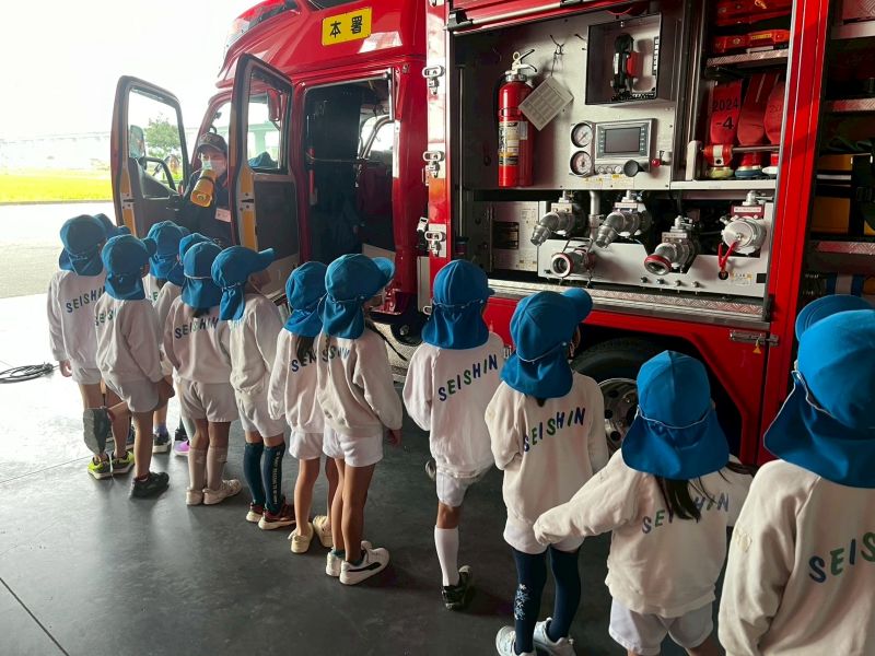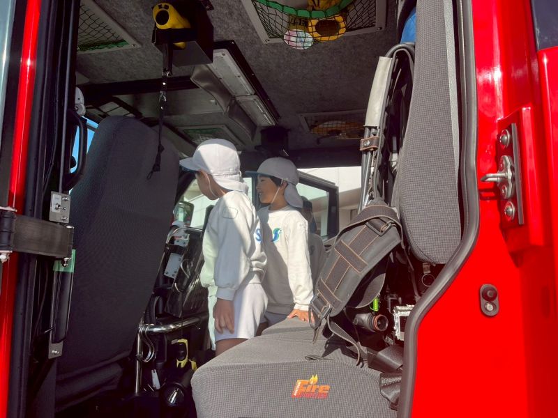 消防署が近づいてくると「あっ、見えた!」と大喜び。なかなか入れない救急車や消防車に乗せてもらったり、消防車に積まれているものを見せてもらったり興味津々。