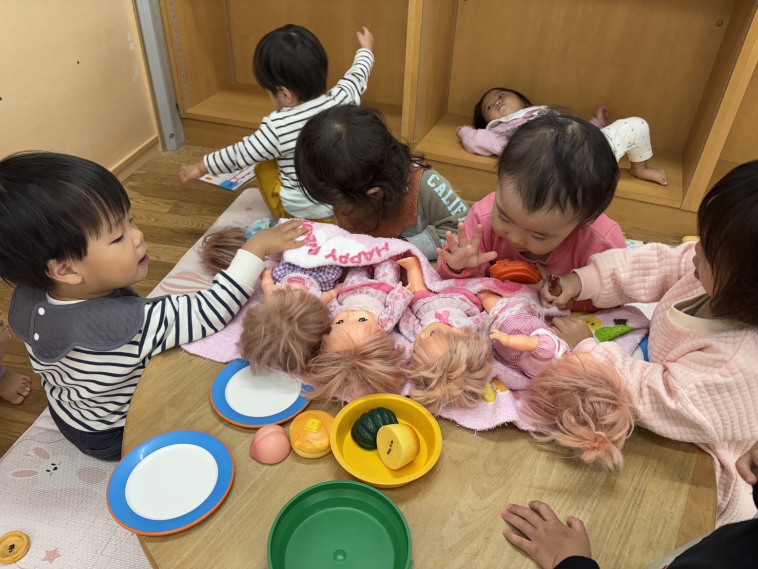 また、メルちゃん人形にお布団を掛けると「ねんねー」とトントンしてあげていますよ。