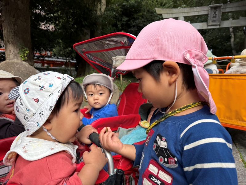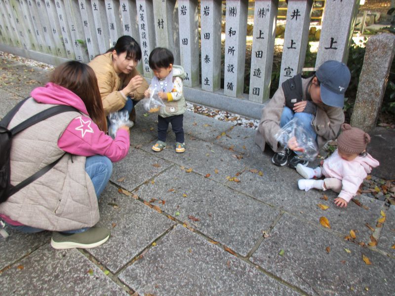 - お部屋で遊んだり、歌を歌ったり、体操をした後、荒見神社にお散歩に行きました♪とっても心地良い天気で、おうちの方と一緒に嬉しそうな子どもたち!荒見神社でドングリや葉っぱと見つけ、興味津々に触ったり、拾って袋に入れたりと楽しんでいました!