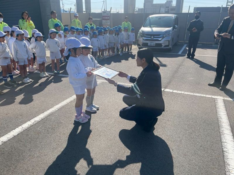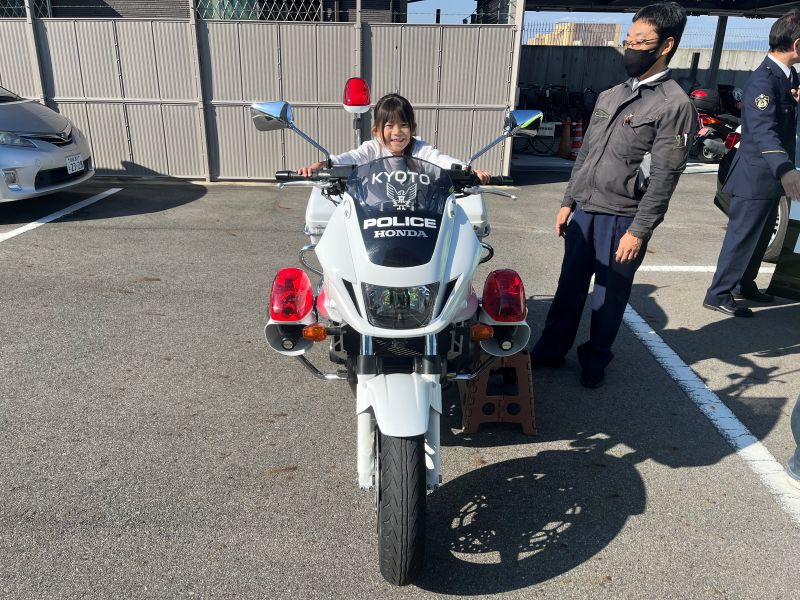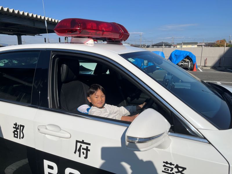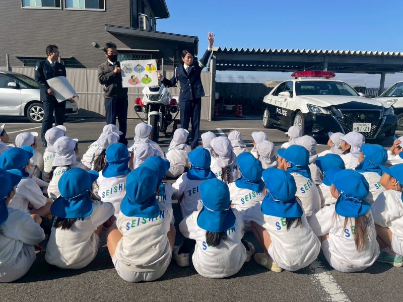 - 警察署にあるパトカーや白バイを見て「かっこいい~」と興味津々。警察官の方から交通安全の話や横断歩道の安全な渡り方を聞いた後、パトカーと白バイに乗せてもらえることに!「ちょっとドキドキした~」や「初めて乗れて嬉しい!」と友だちと話していました。そんなみんなの目はキラキラと輝いていましたよ♪