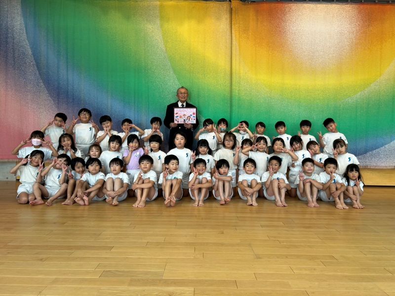 理事長先生に喜んでもらい嬉しそうな子どもたち。最後にみんなで記念写真を撮りました!