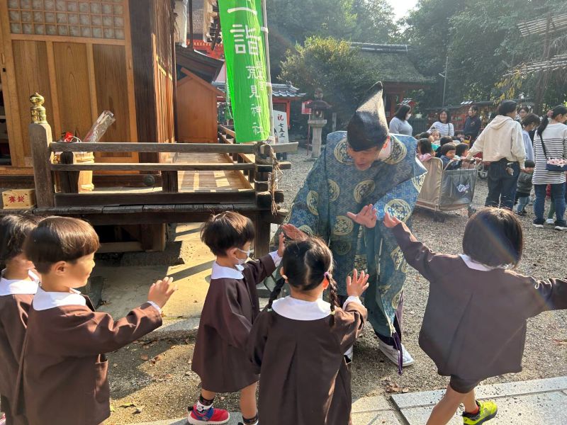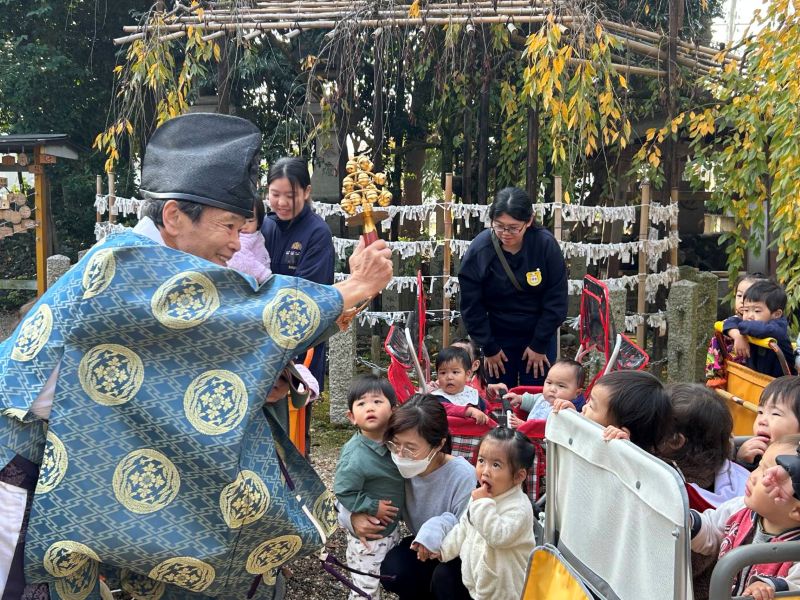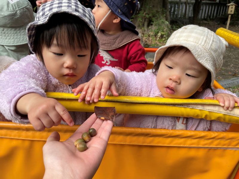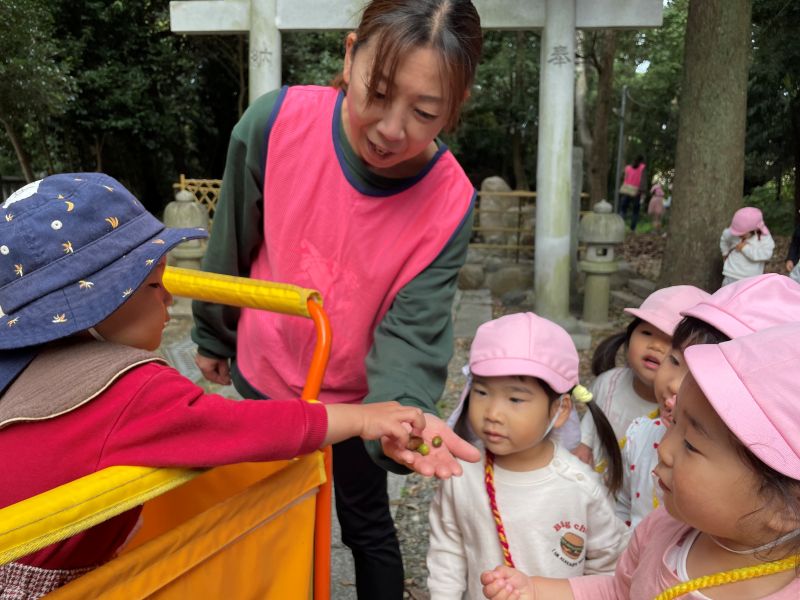 道路を走る車に「ぶーぶー!」「ばいばーい」と外の景色を眺めたり、途中荒見神社へも行くと「どんぐりあったよー!!」とレモン組のお兄ちゃん、お姉ちゃんたちに見せてもらいました。