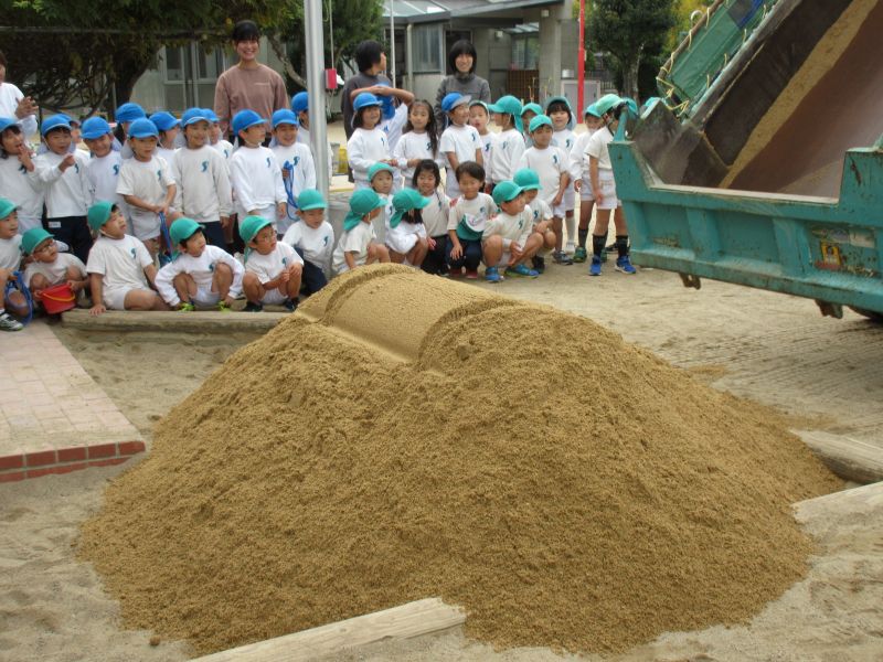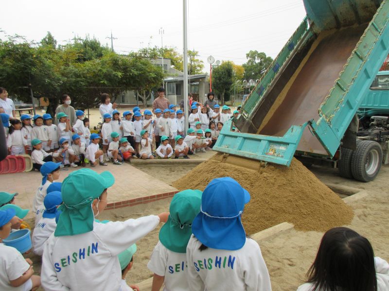- 砂をたくさん積んだトラックが入ってきて、ワクワクが止まらない子どもたち!