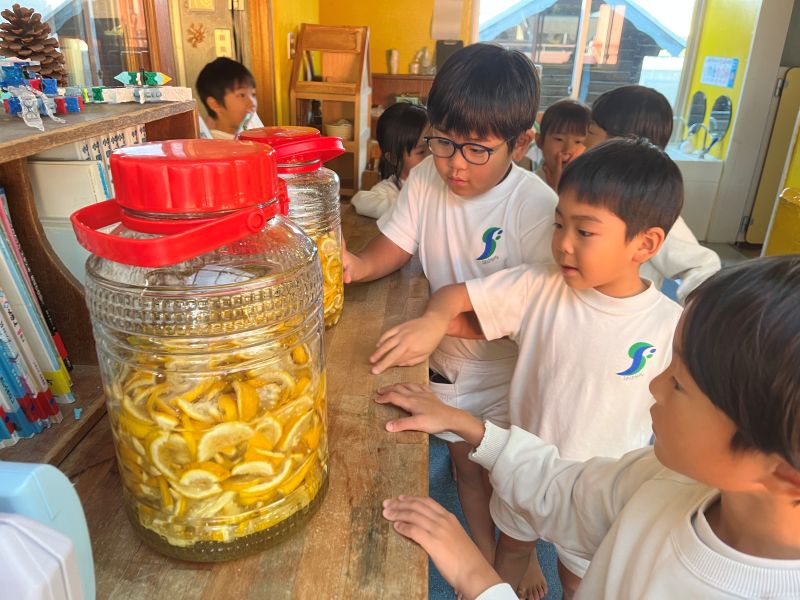 - 園庭になっている柚子を収穫し、自分たちで柚子を切って、氷砂糖を入れて溶けるまでジュースはお預け...