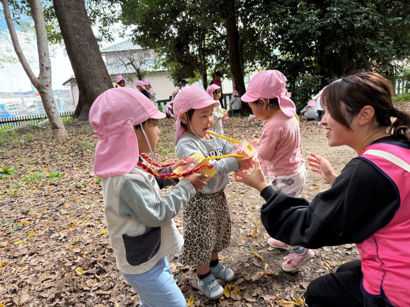 見つけたドングリや落ち葉を李組のお友だちや保育者に見せ、楽しんでいましたよ‼