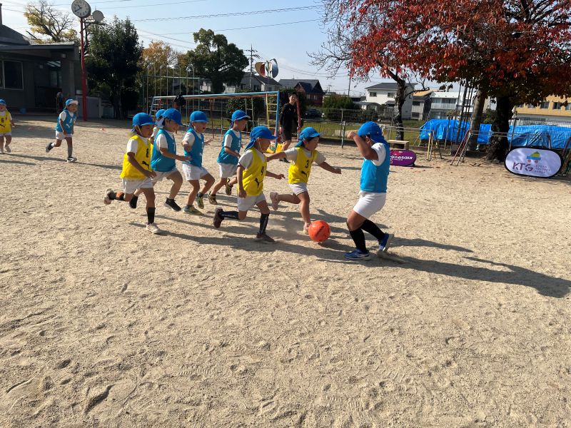 最後はチームに分かれて試合!ゴールを決めて「やったー!」と喜んだり、ドリブルで攻めたりとみんなの目は輝いていました。