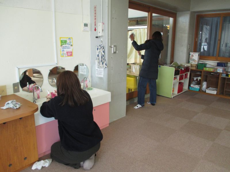 卒園児も来てくれ玩具や棚を拭いてくれたり、保護者の方は脚立などを使って高いところや細かいところまでピカピカに!