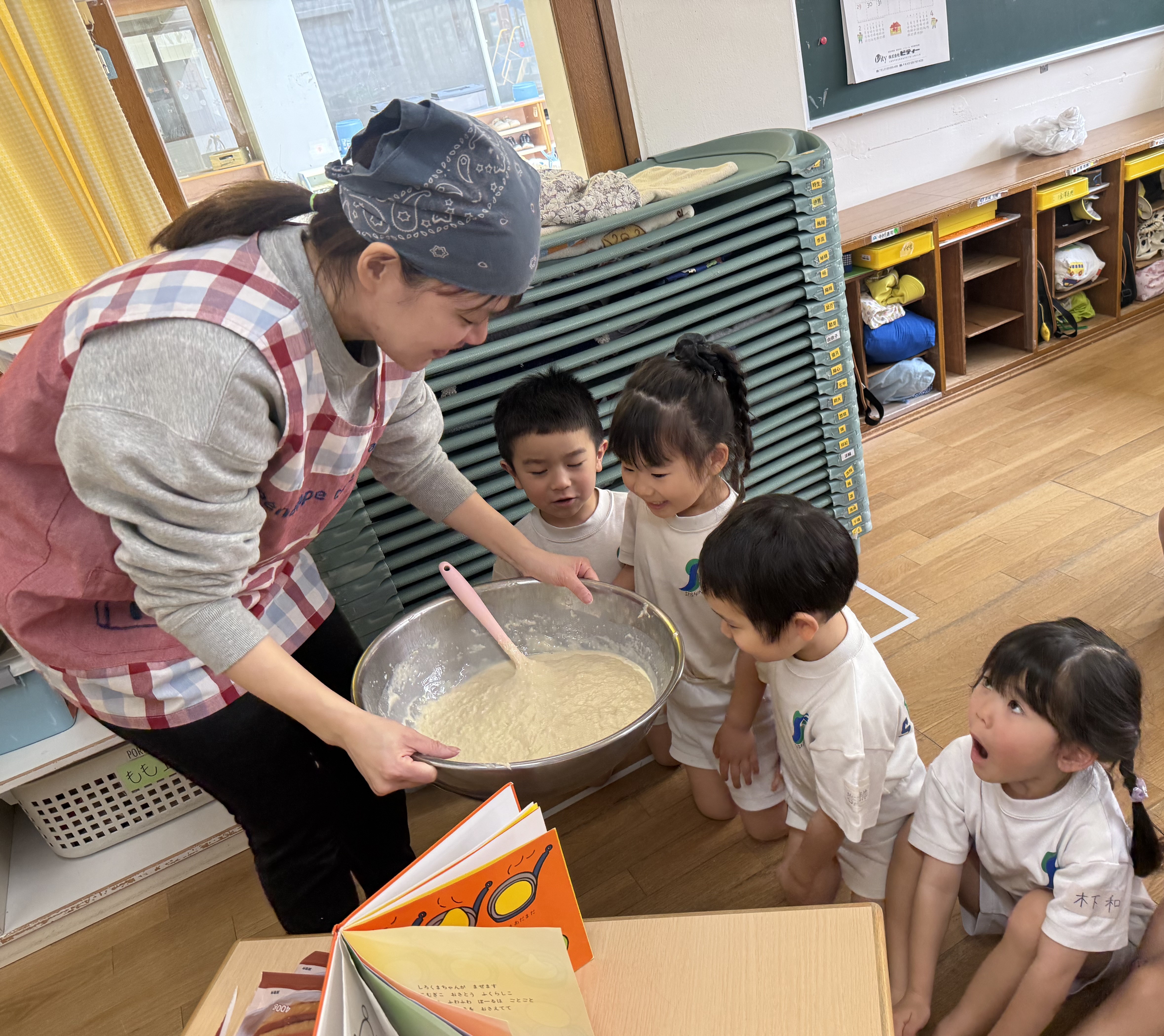 焼きはじめプツプツしてくると「絵本と一緒や!」と目をキラキラさせる桃組さん
