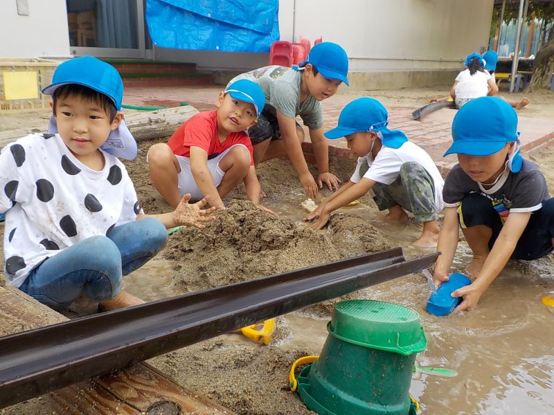 - やかんに水を入れて砂にかけると、どんどん泥になっていくことに興味津々!!「どろどろ~」「手についた」などと、いつもの砂遊びとは、また違った感触を楽しむ子どもたちでした♪(^^)