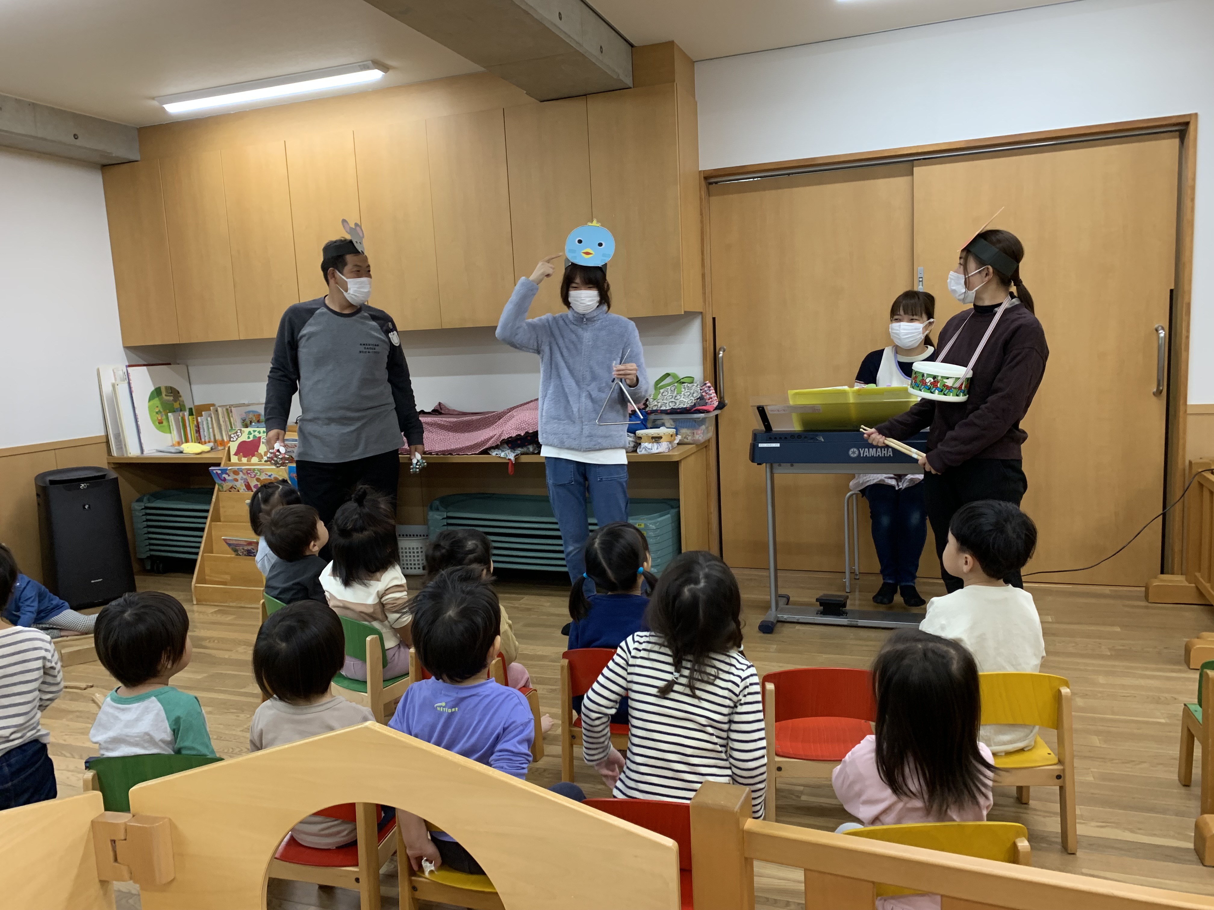 - 小麦粉粘土で遊びました。作る時から興味津々!水を入れると「わー固まってる~」「やりたーい」と子どもたち。小麦粉粘土の感触を楽しみながら「ヘビできた!」「おにくあげる」といろんなものに見立てて楽しんでいました。