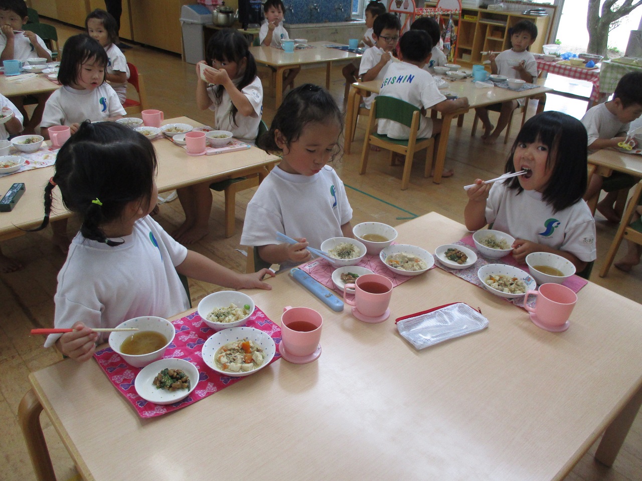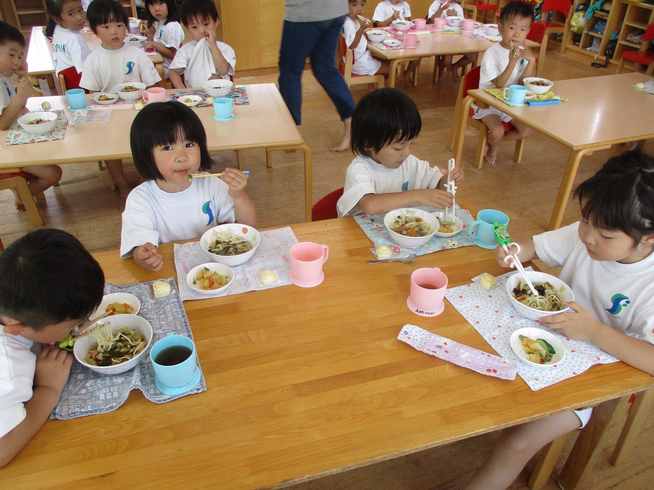 - 紐通しをしました。星形のパーツをしっかりつまんで、一つずつひもに通していきます。一つ通すたびに「できた!」と保育者に見せてくれる子どもたち。最後にお部屋に飾るととても嬉しそうに喜んでいました。