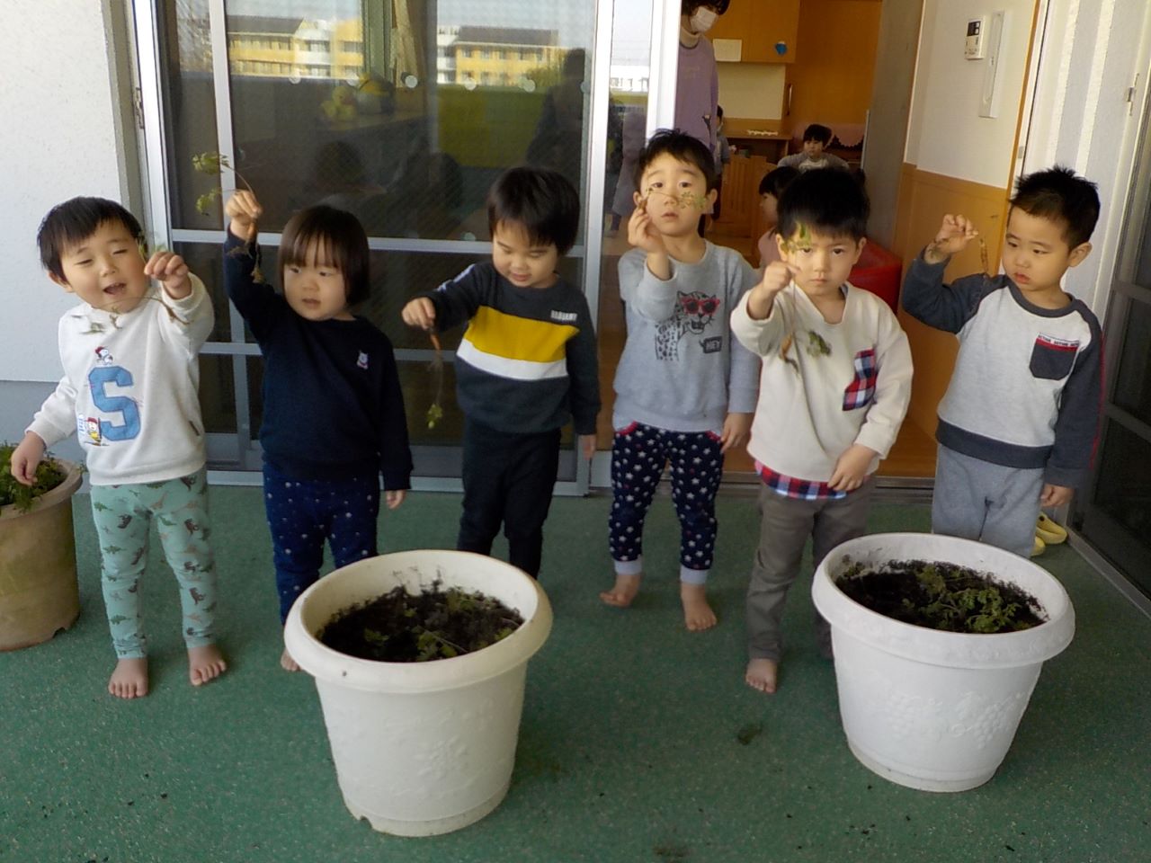 - 職員が環境整備で藤棚の葉っぱの剪定をしていると、それに気付いた桜組の子たちが「この葉っぱあつめるわ」とほうきやゴミ袋をもってお手伝い!その姿を見ていた桃組さんも、お兄ちゃんお姉ちゃんの真似をしてお手伝いをしている姿が見られました。落ちている葉っぱがなくなると「きれいになったな~」とみんな嬉しそうな表情を見せていました。