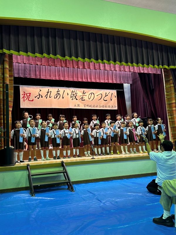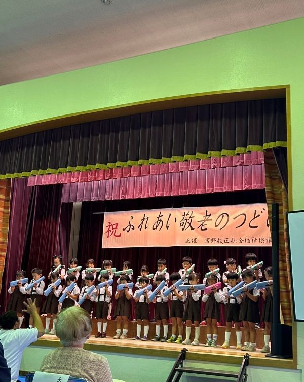 - 第29回 富野校区のふれあい敬老のつどいに出演し、歌とピアニカ奏を披露しました♪少し緊張した表情でしたが、歌い始めるといつも以上に声を出し、張り切る姿が見られました。最後には、たくさんの拍手をいただき嬉しそうな子どもたちでした。