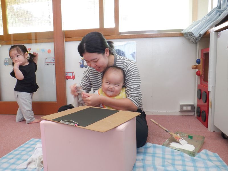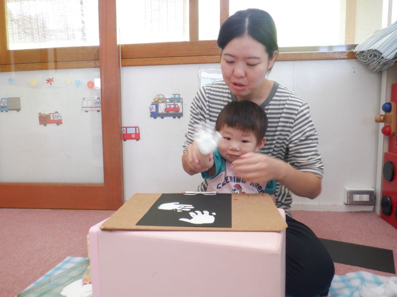 制作の準備をしていると、楽しみに待っている様子や、「ぺったんした!」と 手のひらを見せてくれましたよ!