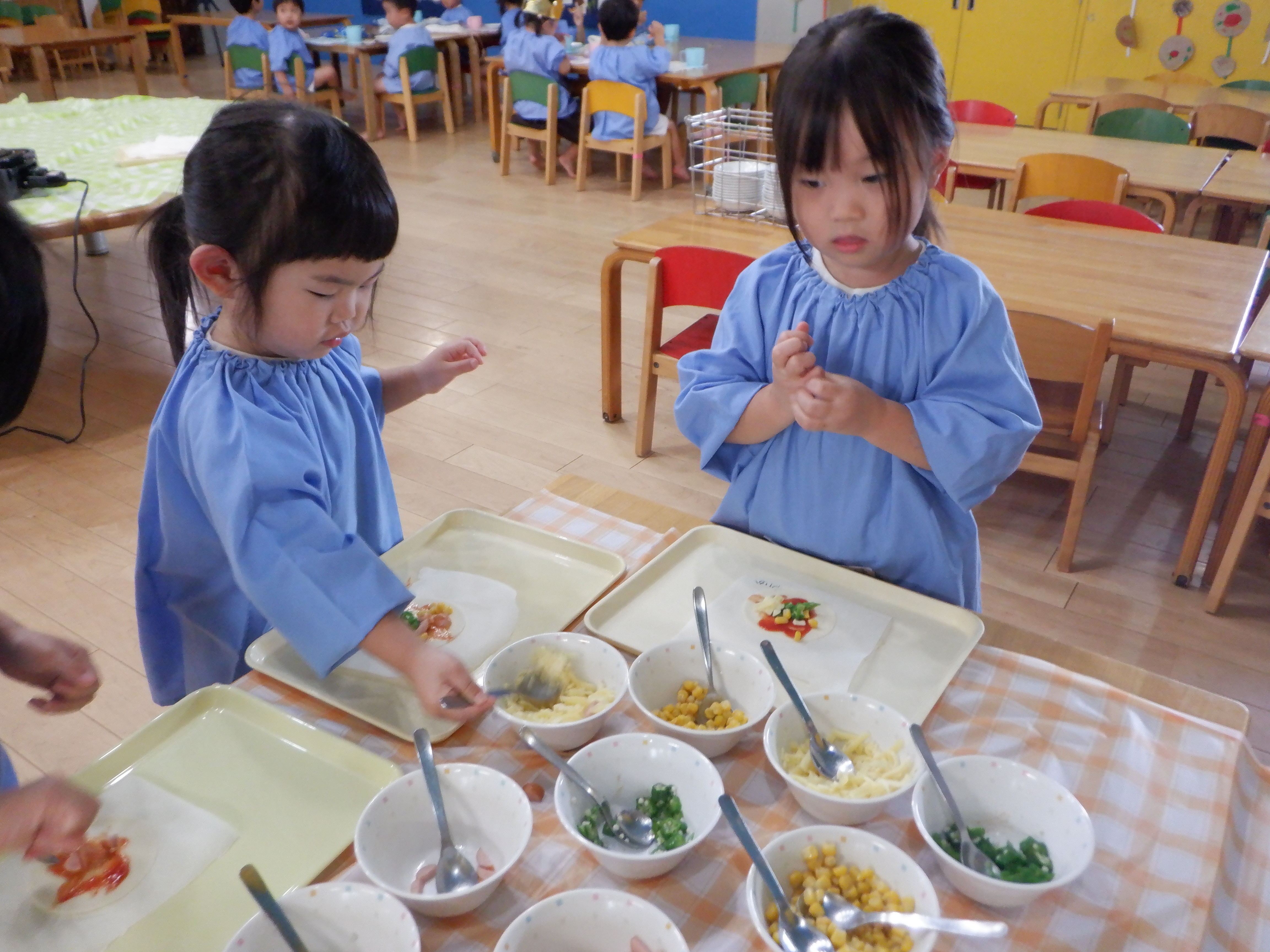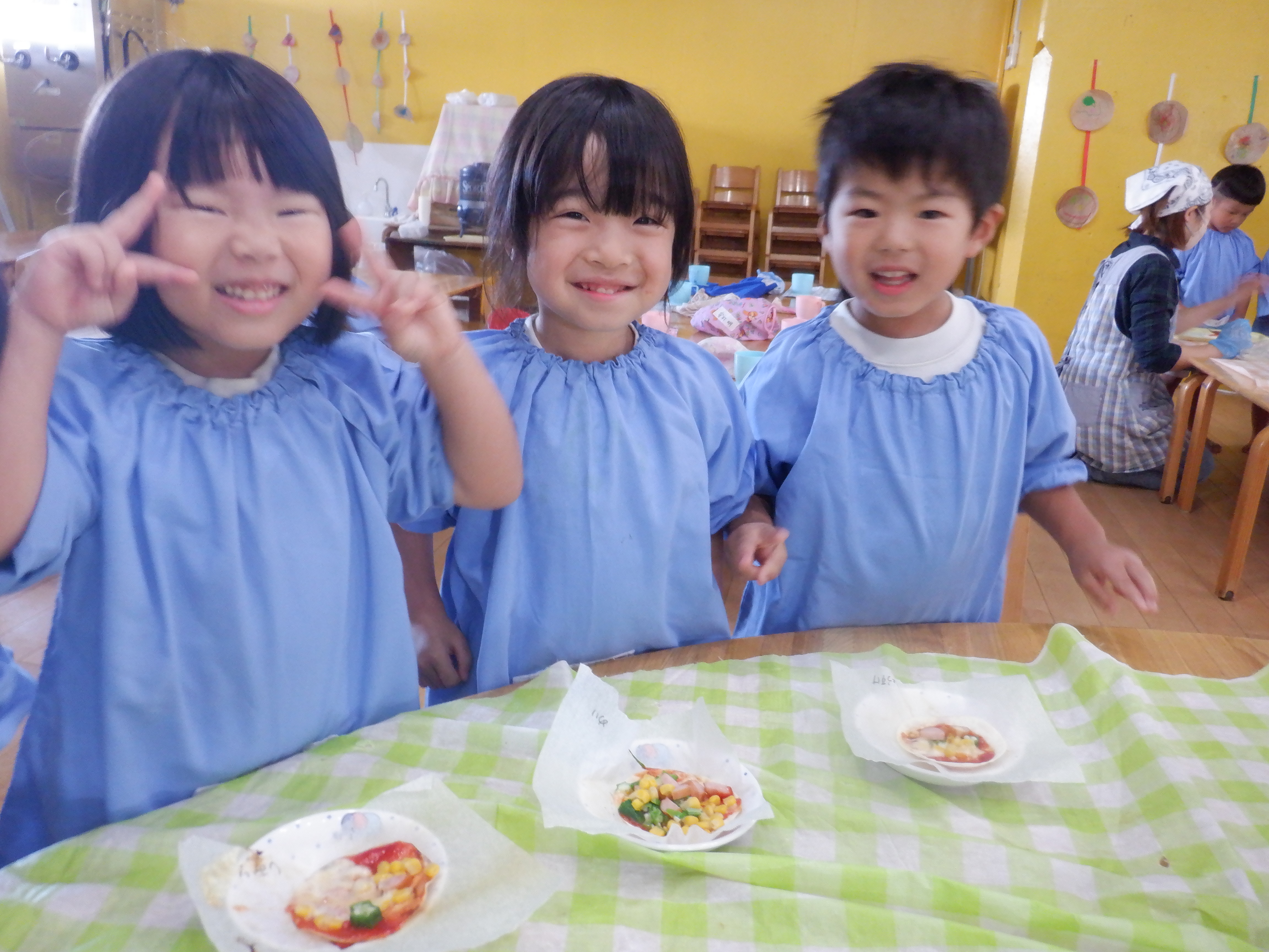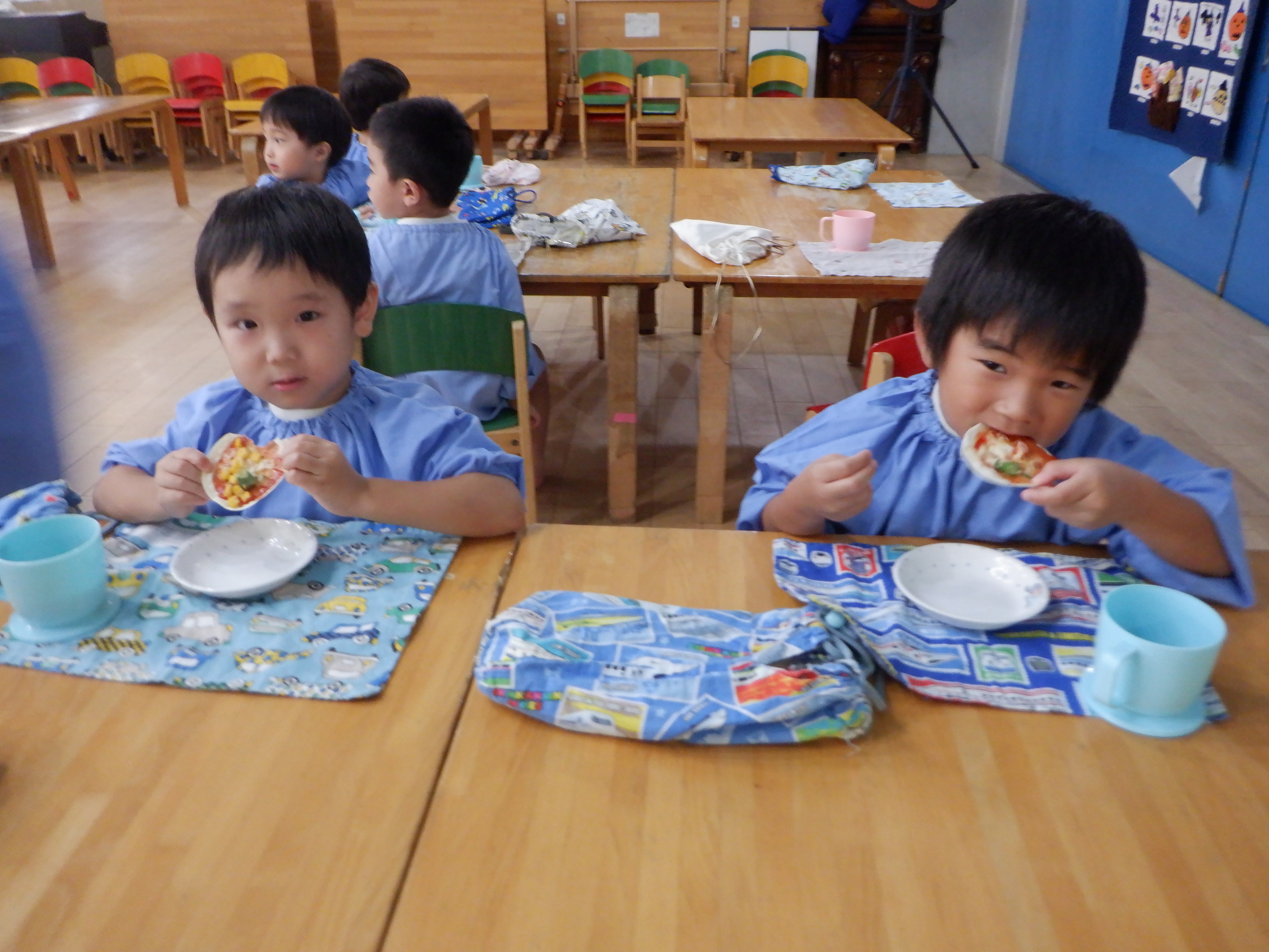 - お店屋さんごっこでピザ屋さんをした桃組さん。あれから「ピザおうちで食べたよ」「ピザ食べたいな」などピザの話をたくさんしていたので、みんなで作って食べることに!餃子の皮にケチャップをぬりぬり。ウインナーやコーン、オクラにチーズの中から自分の好きな具材を乗せて、ホットプレートで焼きあがるのを待ちます。いざ、焼きあがって「いただきまーす♪」と食べるとみんな「おいしい!」と満面の笑みを浮かべていました(^^)♪