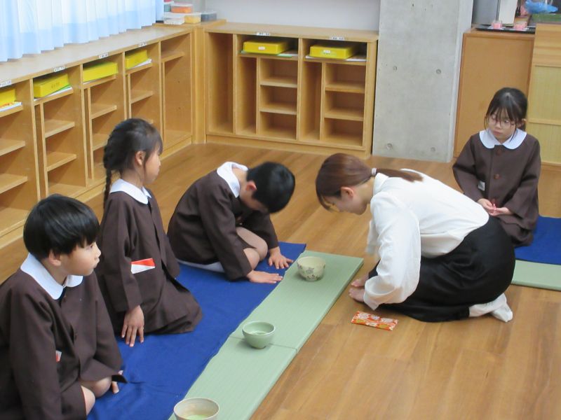 - お作法を教えていただき、桃の花のお茶菓子を一口サイズに切り分けて口に運び「おいしい!」と食べたり、お抹茶を口にして「ちょっと苦い~」や「飲める!」と最後まで飲んだりと様々でしたが、お茶会の雰囲気を楽しんでいました。