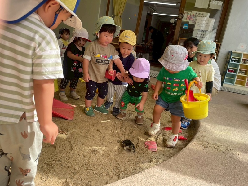 型抜きやお山づくりなど思い思いに楽しんでいると、なんと保育園で飼っているカメさんが…!