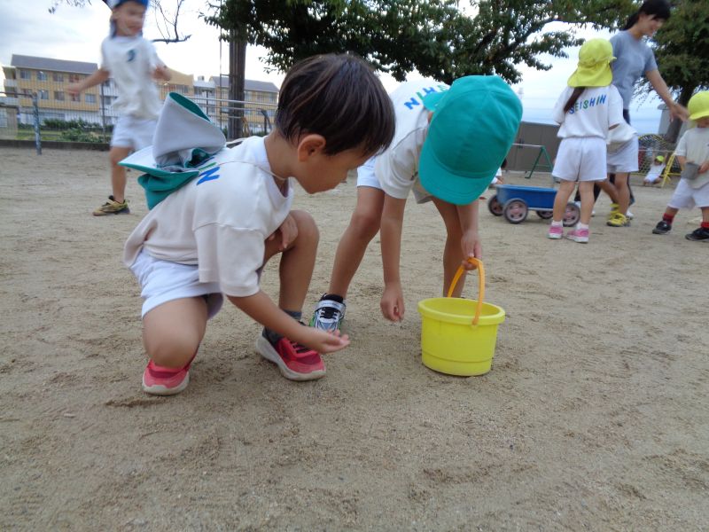 運動会に向けて、園庭に落ちている石を拾いました。「見て!大きいの拾った!」「こんなにいっぱい集めたよ~」とワクワクで拾っていました。