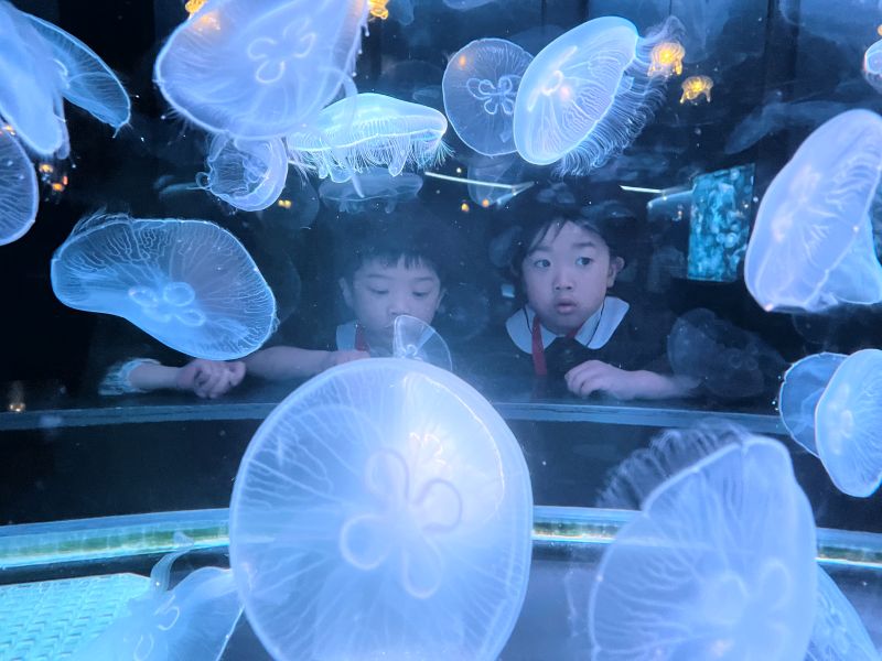 ワクワクで楽しみ!という気持ちが表情に出ていました。たくさんの魚やイルカショーをキラキラと輝かせてみていました!