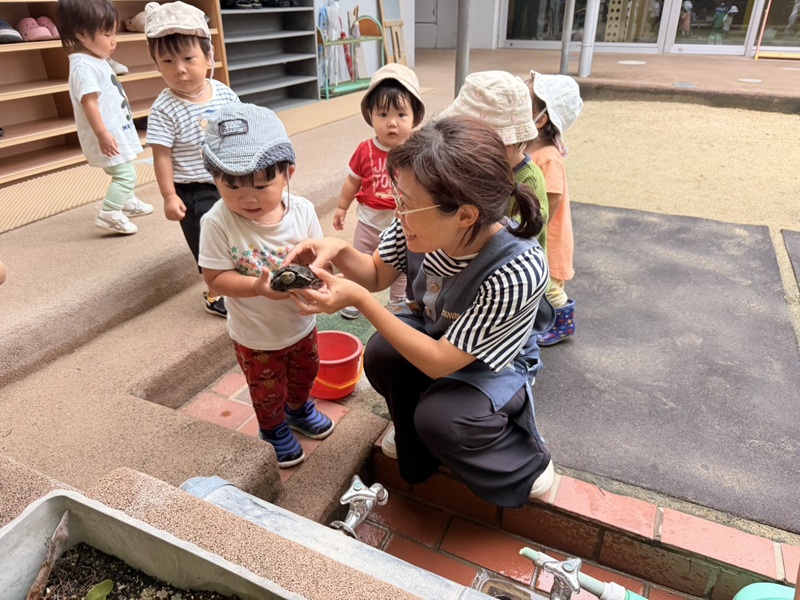 保育者がカメさんをお散歩させると、大喜びで追いかけたり「カメさん!」と呼ぶ子もいました。