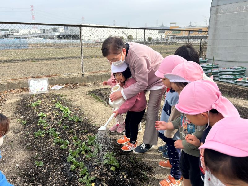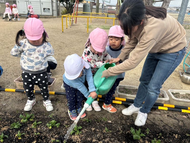 保育者と一緒にじょうろで「大きくなーれ大きくなーれ」と水やりを楽しむ姿が見られましたよ。