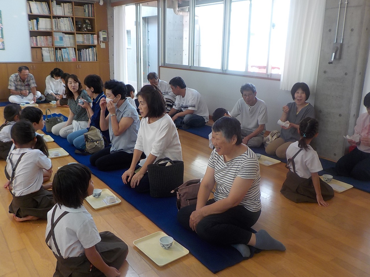 梅組は緑茶、桜組はお薄をいただきました。お作法を教えてもらいお行儀よくいただいていた子どもたちです。
