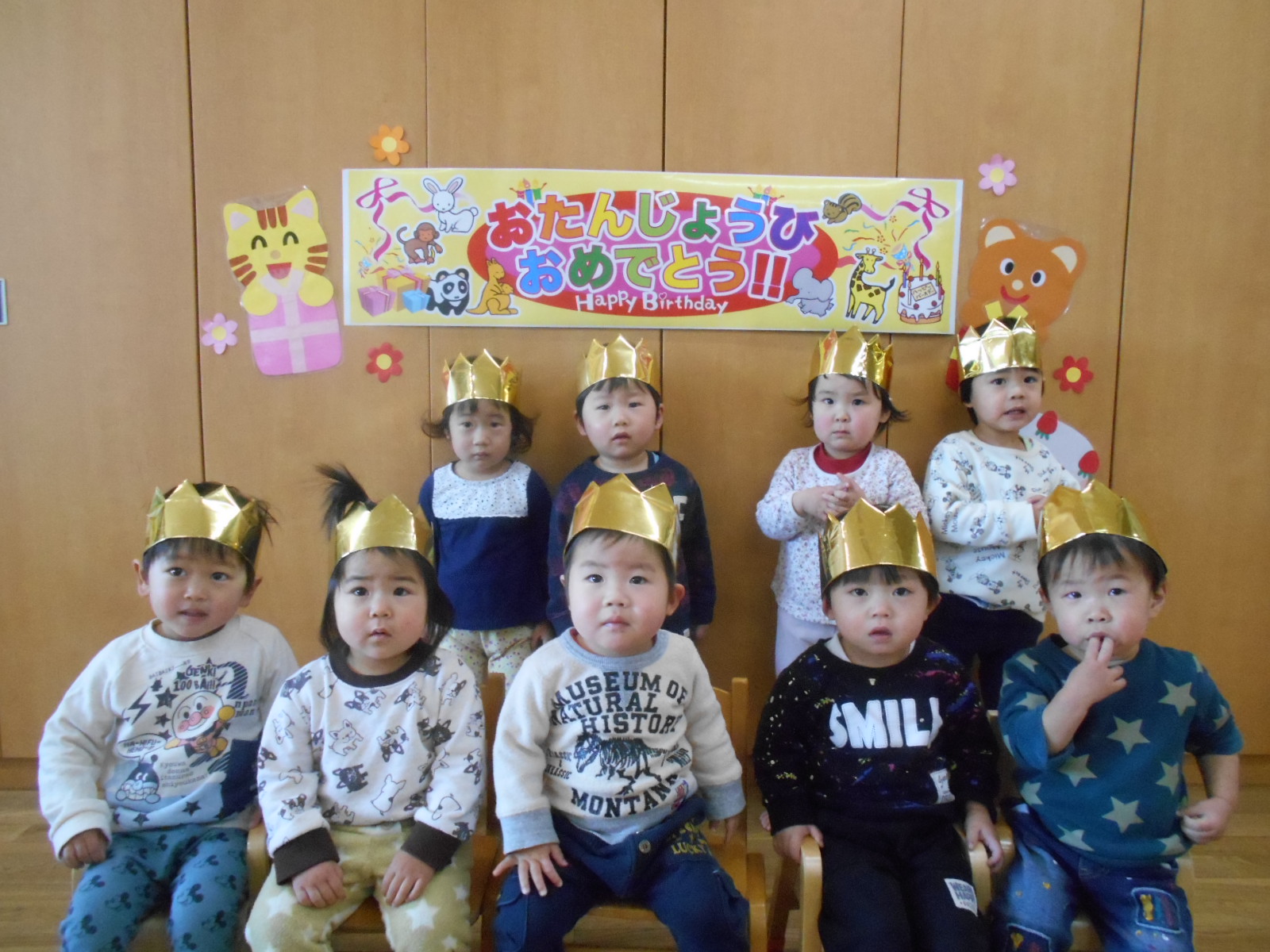 桃組さん(3歳児)はホールで初めての誕生会にドキドキ!誕生児は舞台に上がり、みんなにお祝いしてもらいました。