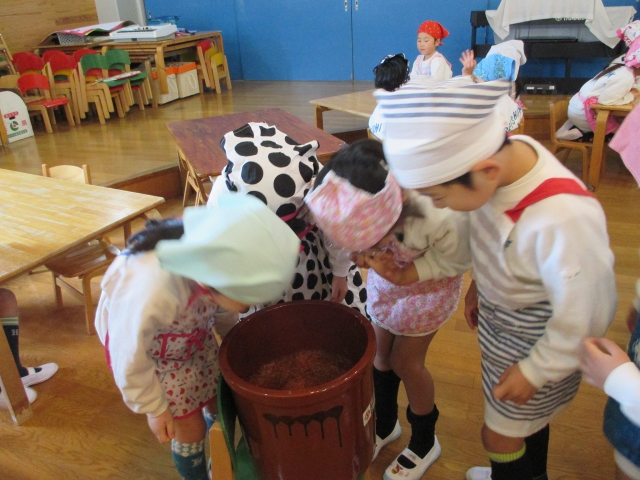 「おいしいお味噌になーれ♪」「麹菌がんばってね」と子どもたち!