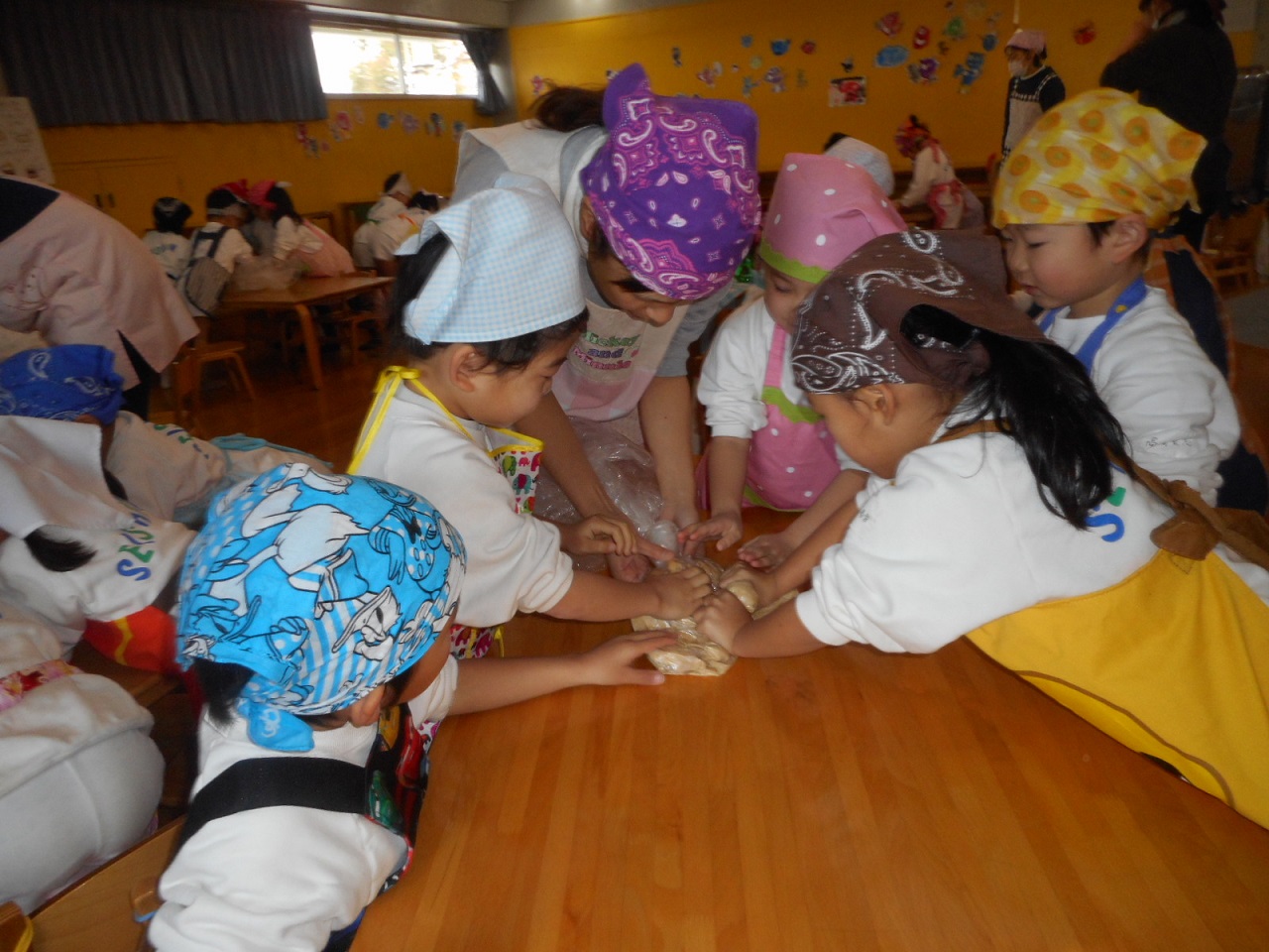 杏組(1歳児)は小麦粉から粘土を作って遊びました。お父さんお母さんにとっても初めての経験になった方も多く、子どもたちと一緒に、触った時の感触を楽しんでおられました♪その後給食を食べる様子も見ていただき、食育についても話しながら過ごしました!