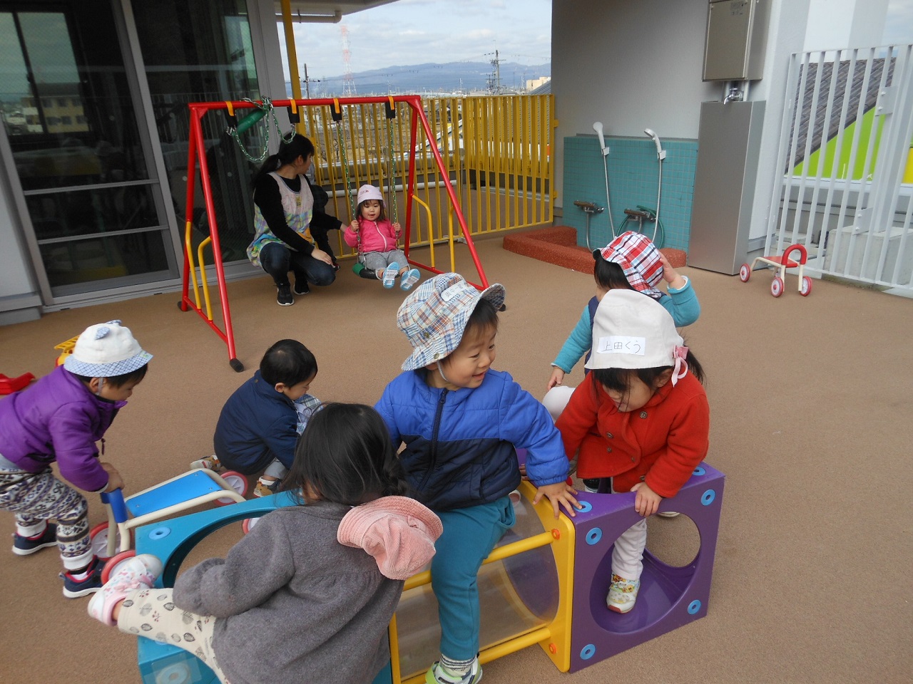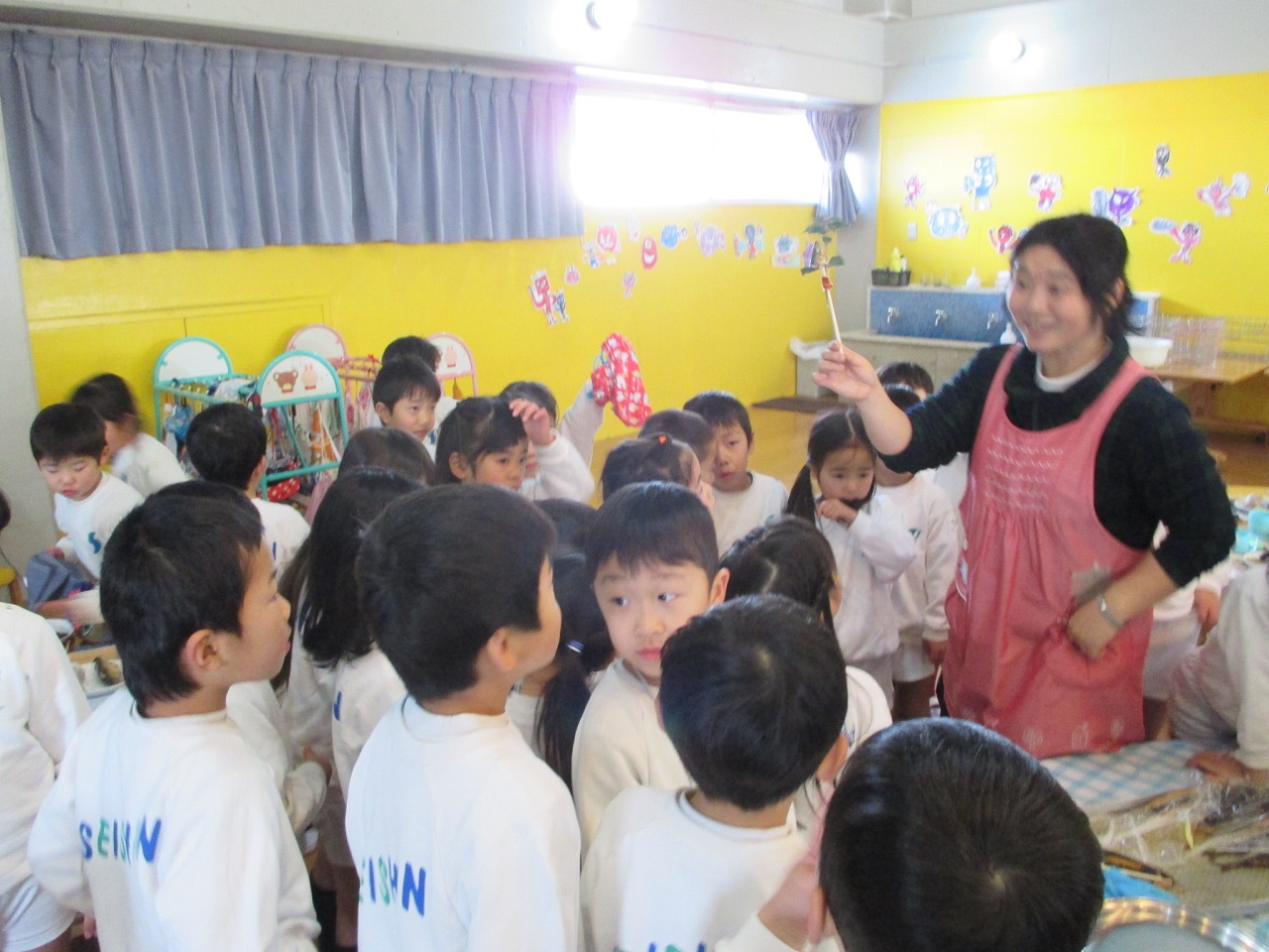節分参りをした後は、子どもたちと心の中にいる「泣き虫鬼、いやいや鬼など色々な鬼さんとバイバイしよう!」と話しながら豆まきをしました。