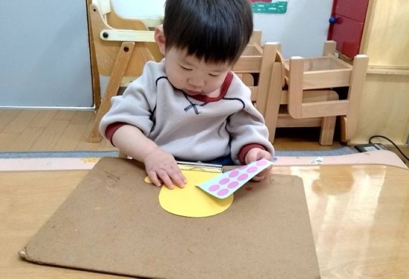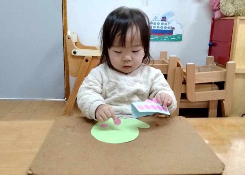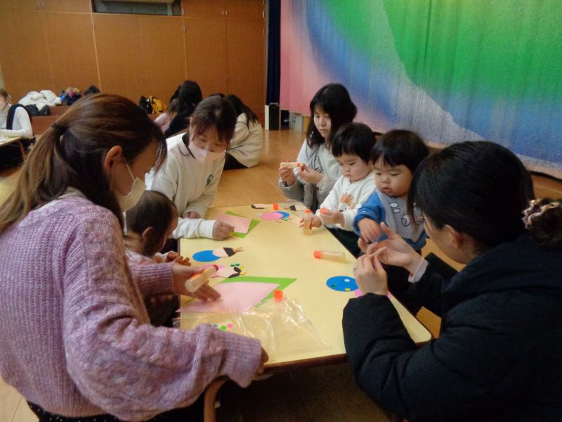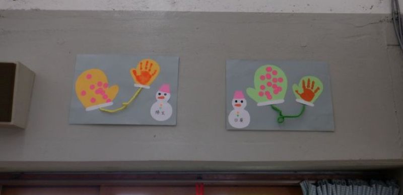 - 手ぶくろを作りました♪シール貼りをする際、台紙を少し折ってもらうと、シールをそーっと台紙から剥がし、慎重に型紙に貼る子や、台紙に折り目をつけずに、一生懸命シールをはがしてみようする姿が、とても微笑ましいです。