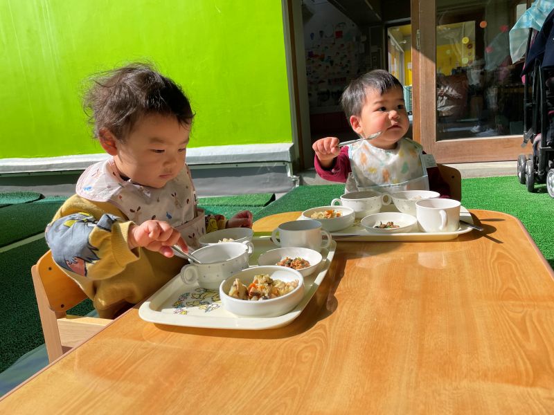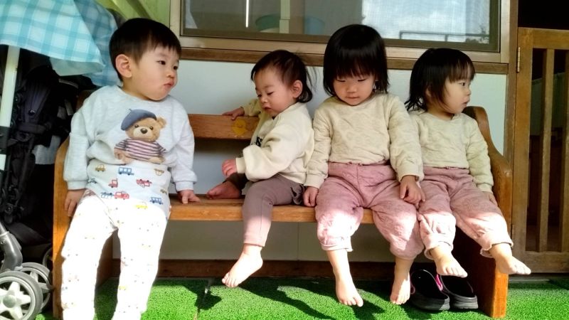 - 今日は、ぽかぽかと暖かく、ベンチに皆一緒に座って日向ぼっこをしたり