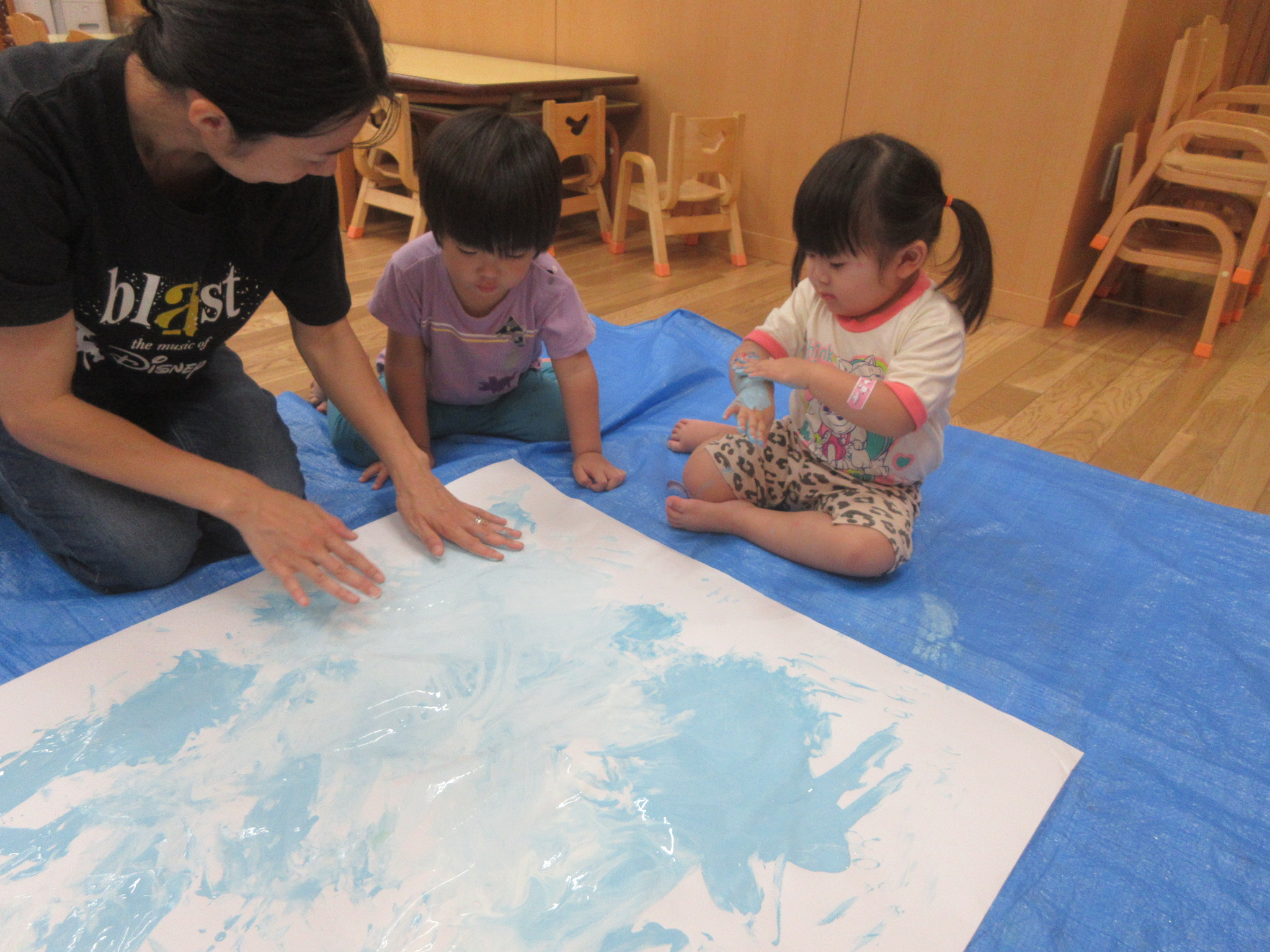 大きな模造紙に色が広がっていく様子を見て楽しみました。