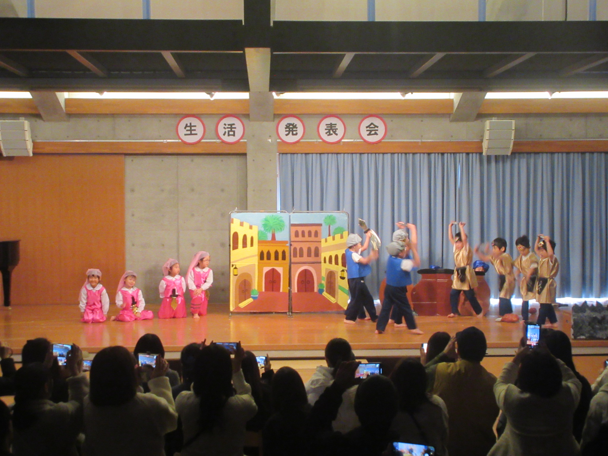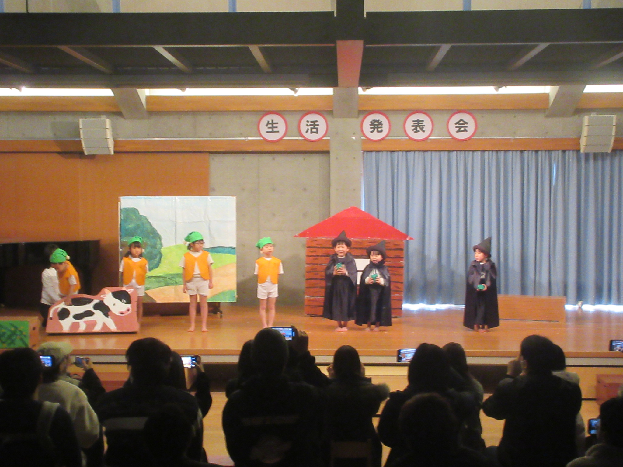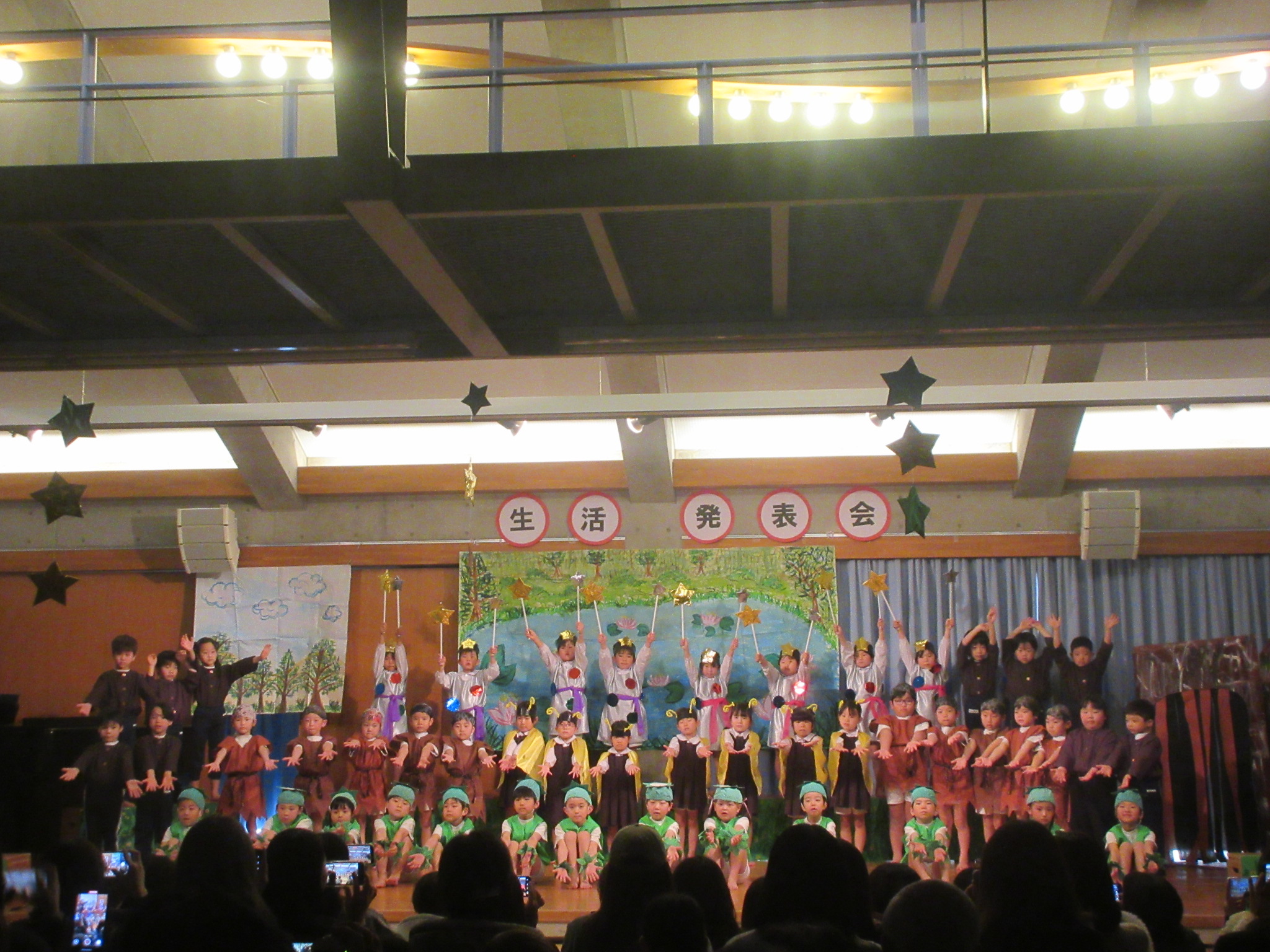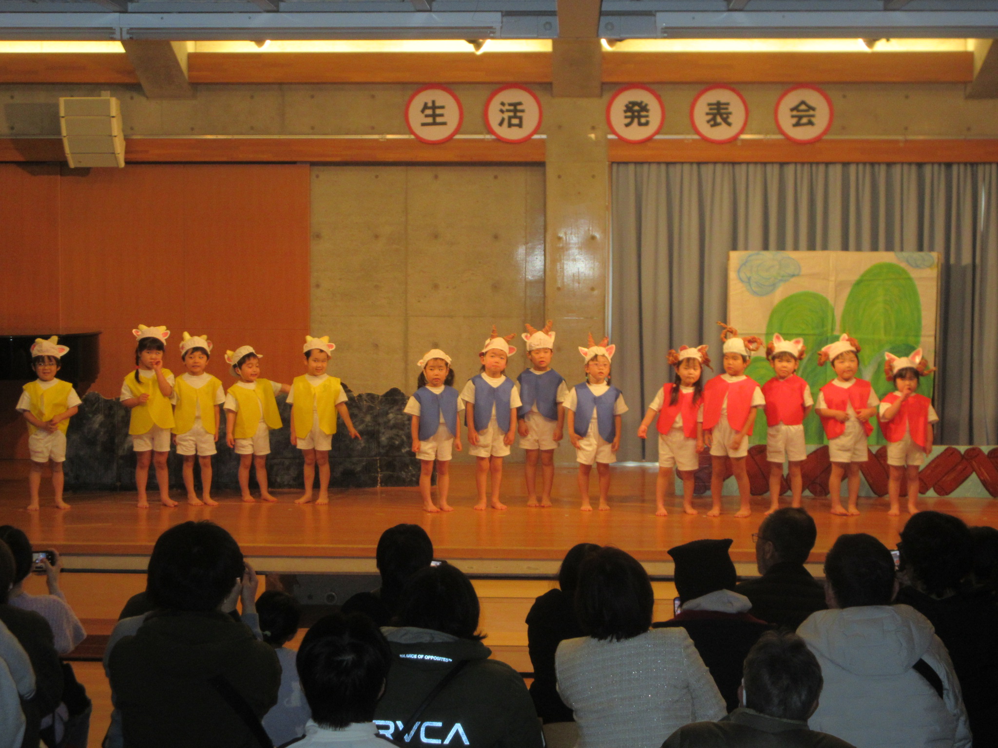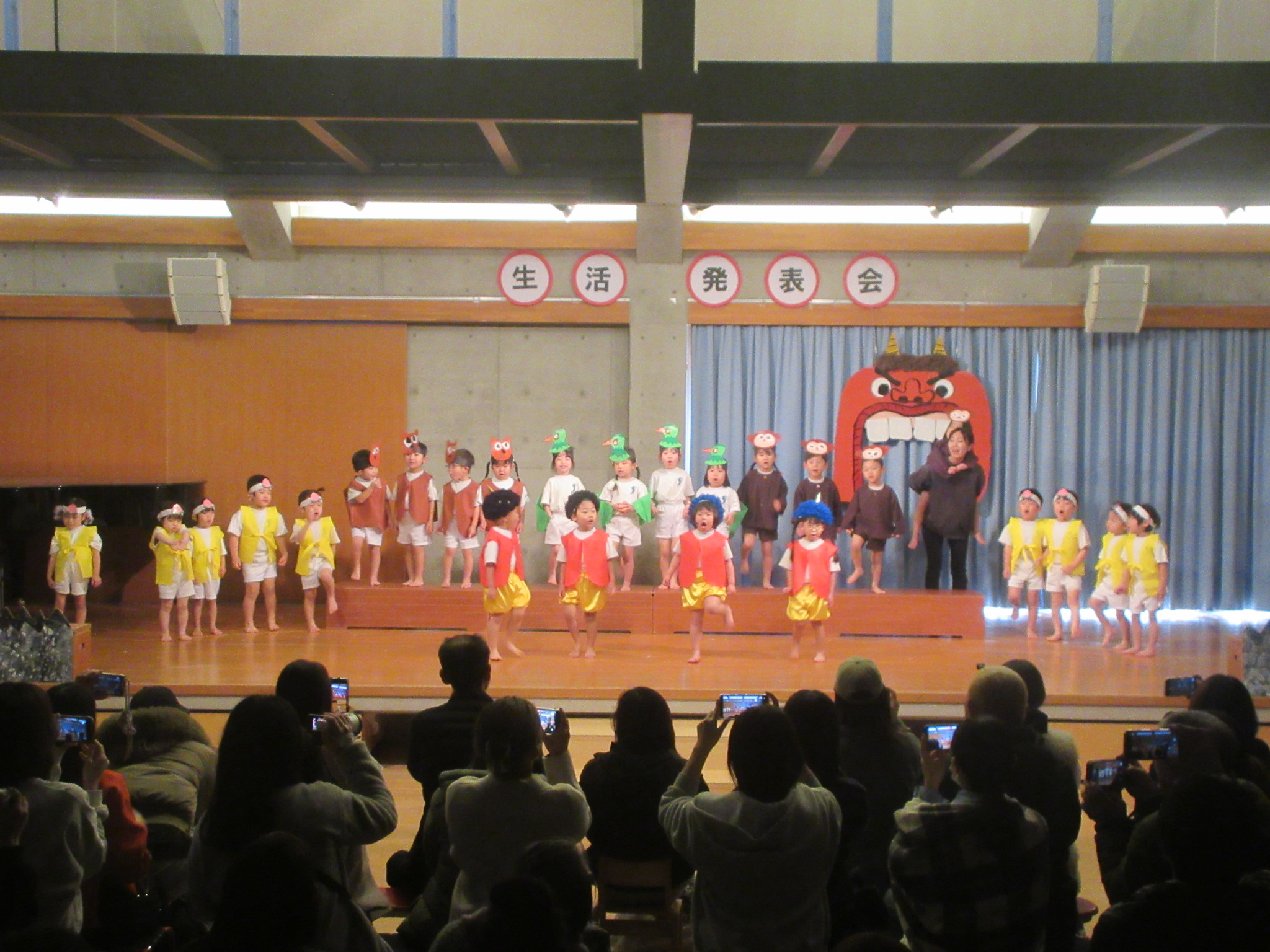 - この1年間にいろいろな経験を積み重ね、成長を感じる生活発表会となりました。たくさんのお客さんの前で、はりきってセリフを言ったり友だちと笑い合って楽しんでいる姿など子どもたちの様子を見て頂けたと思います。お家でもまた、子どもたちと今日のことをお話ししていただけたら嬉しいです。たくさんの方々にご来場いただき、ありがとうございました。