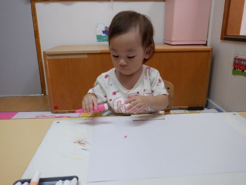 慎重に、画用紙にちょこっと色をつけてみたり、腕を大きく横に動かし横線や