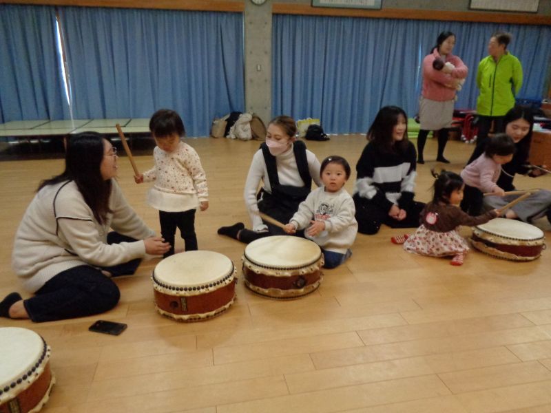 - お雛様やお内裏様の服にシールをぺったんし、おひなさまの完成!そのあと、うれしいひなまつりの歌に合わせて、和太鼓にも触れあいました!みんな興味津々でしたよ♪