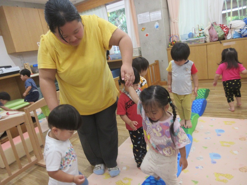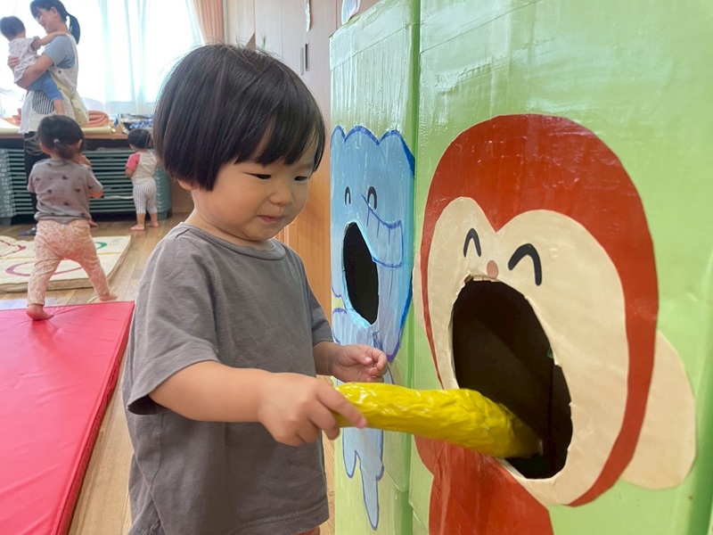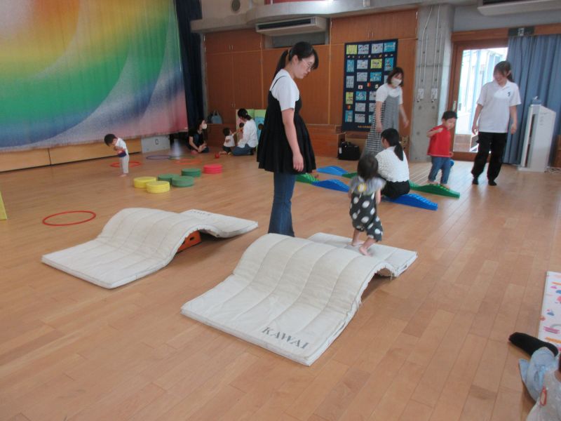 マットのお山を「よいしょよいしょ」と登ったり動物にフルーツを食べさせてあげたり…