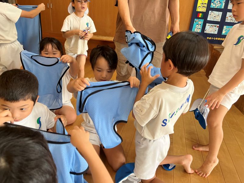- チームに分かれてリレーで着るビブスを実際に着てみることに...