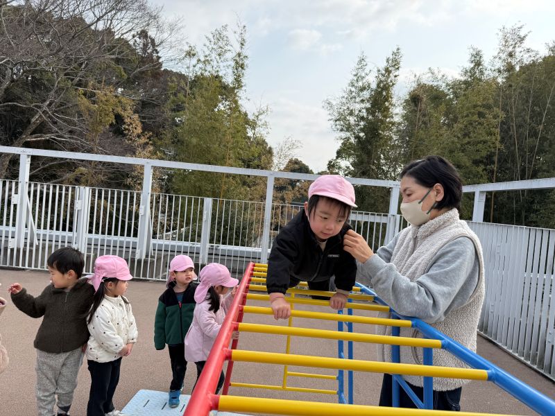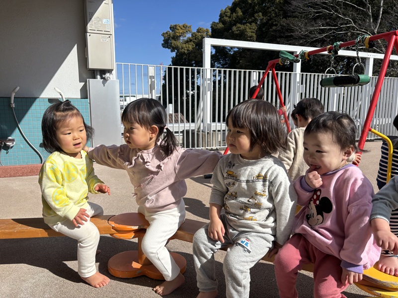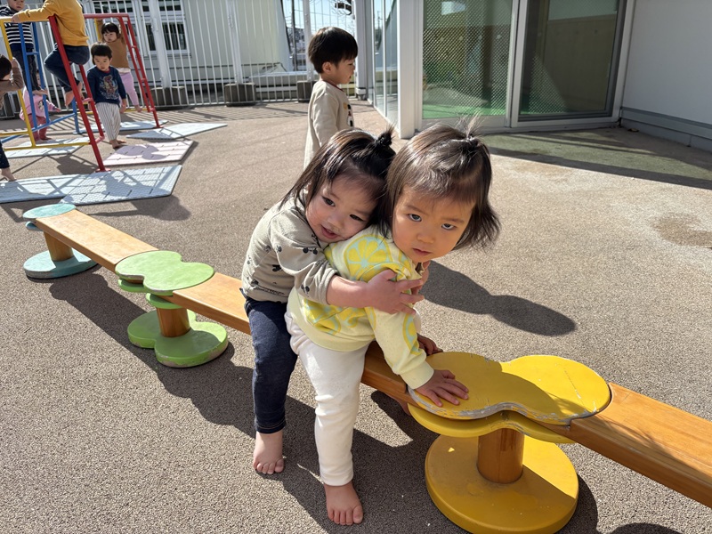 お空を見上げて大きな雲を見たり、平均台に座ってお友だち”好き好き”とギュッと抱きしめたり…