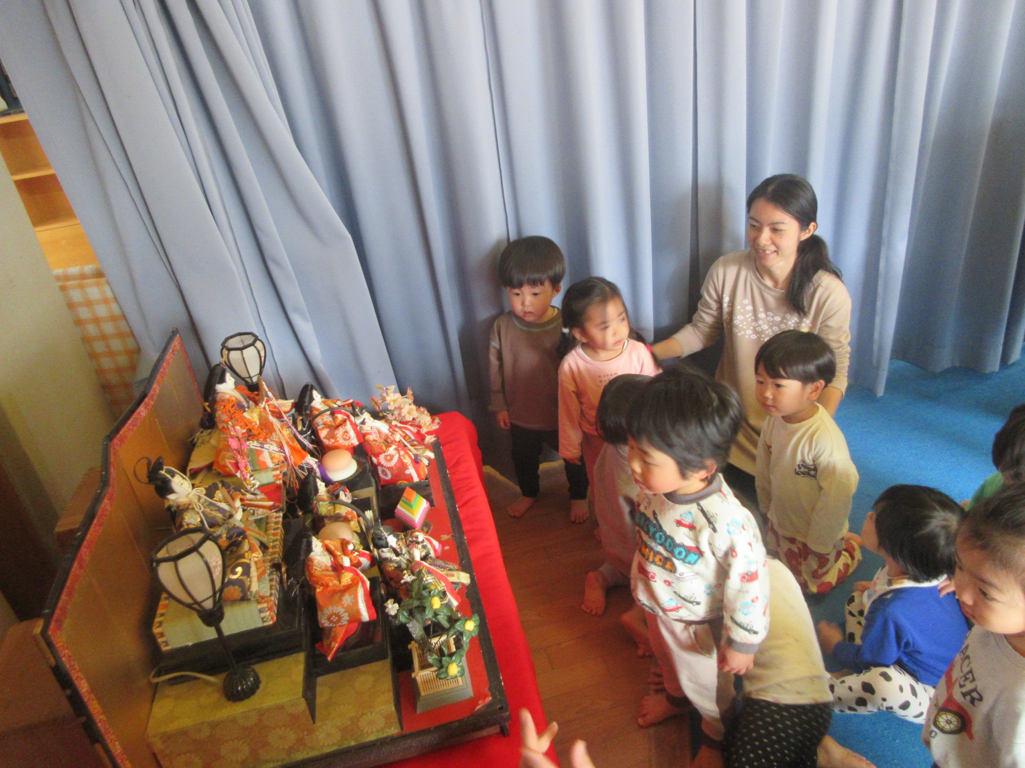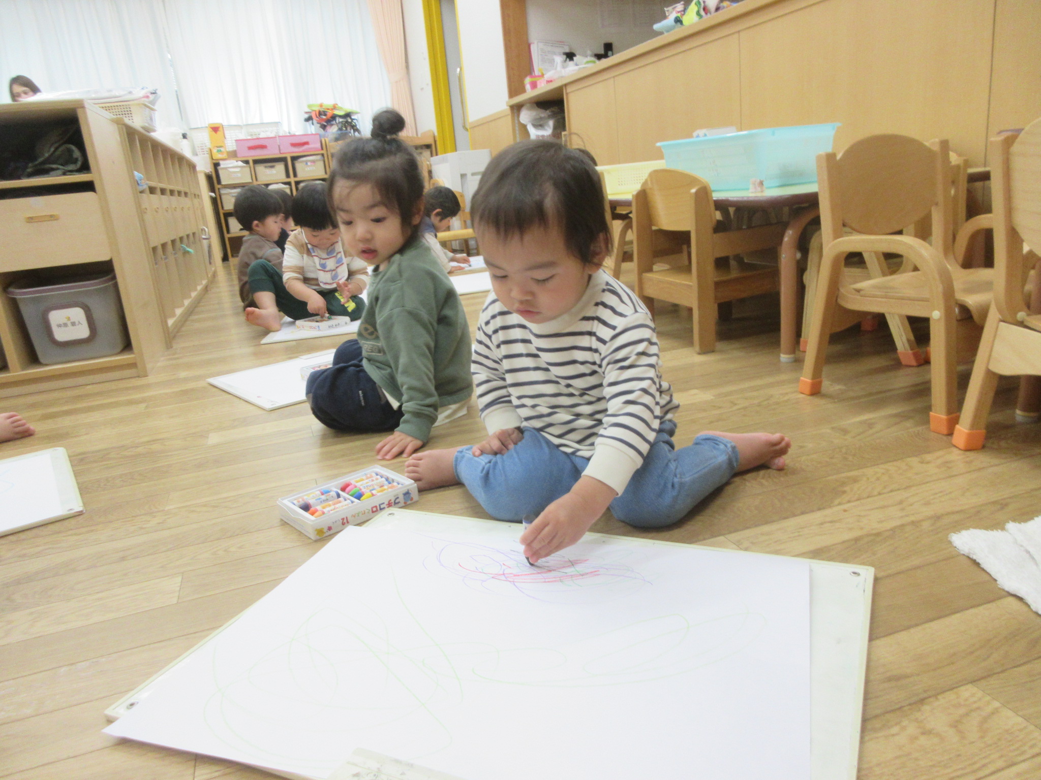 なぐり描きではクレヨンを握り、思い思いに腕を動かし楽しみ、おひなさまはじっと見つめ興味津々な様子でした。