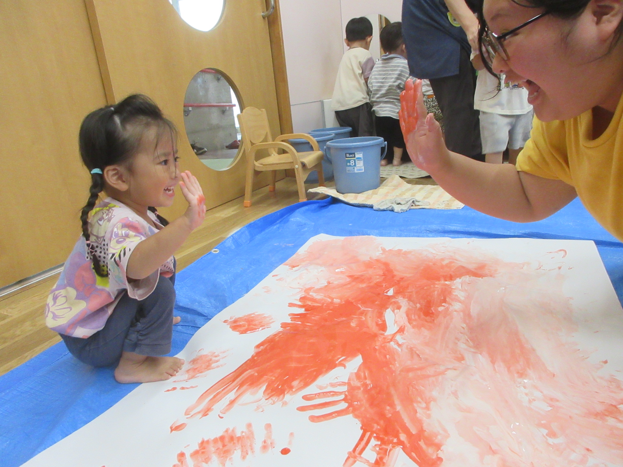 手についた絵の具を不思議そうに見つめたり驚いたり…
