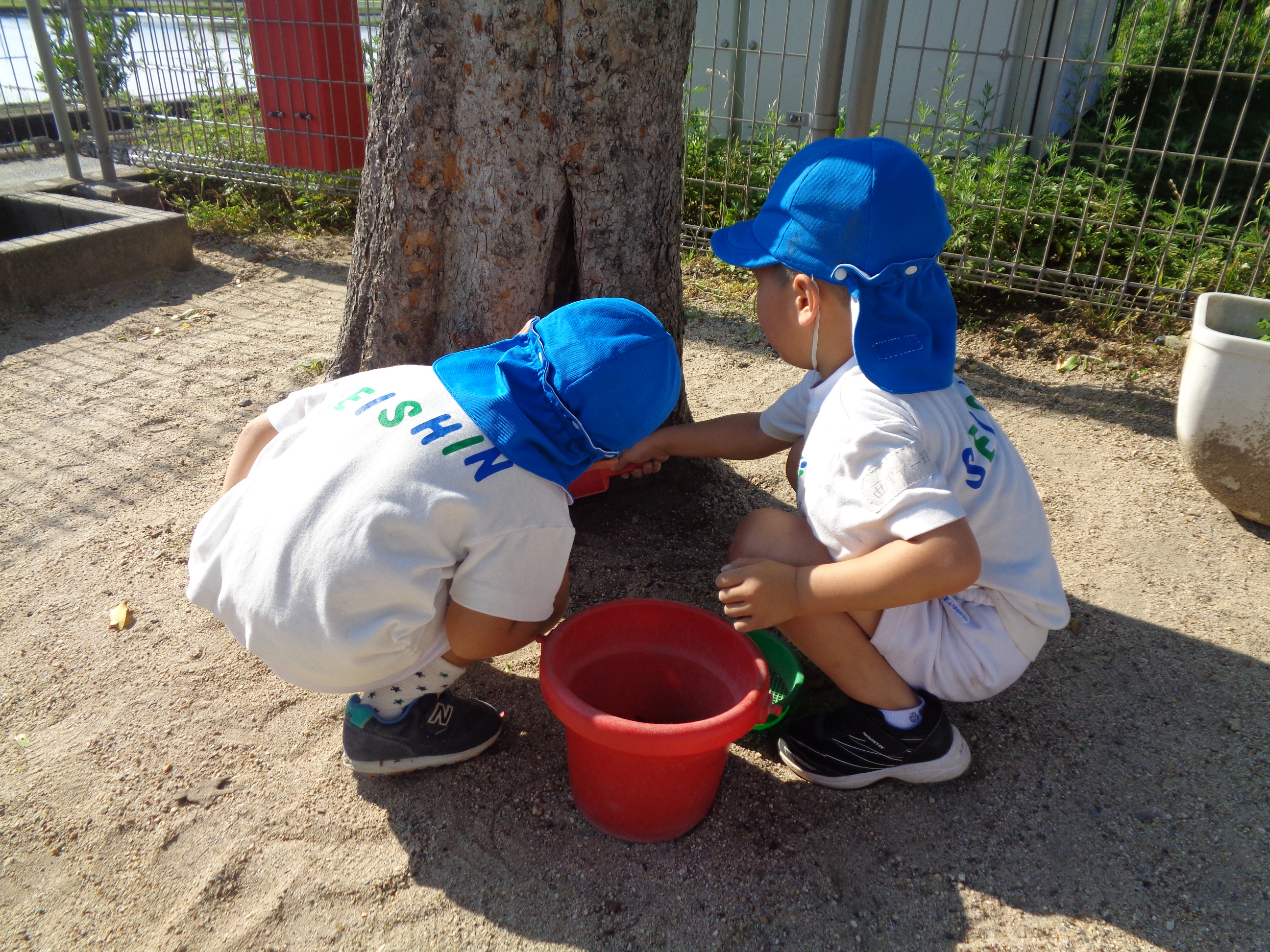 - おままごと遊びが大好きです。テーブルにいっぱいごちそうを並べてモグモグ食べる真似をしたり、保育者や友だちに食べさせてくれたり、使ったコップやお皿をきれいに洗って片づけていました。また、カバンを持って買い物に行く姿もありました。