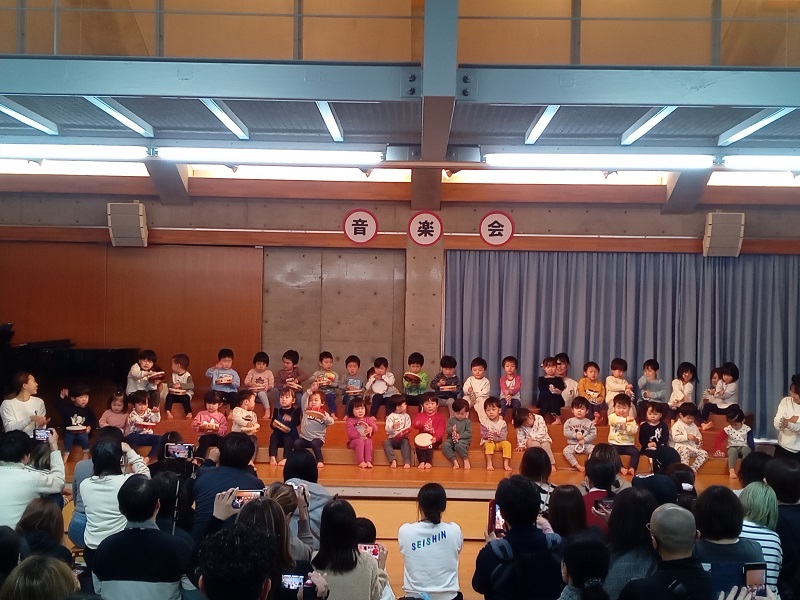 また、ホールでは3・4・5歳児の順に歌やピアニカ奏を発表しました。ステージから客席のおじいちゃんおばちゃんを見つけ嬉しそうな表情を浮かべたり、発表を聴いてもらい満足そうな子どもたちでした。