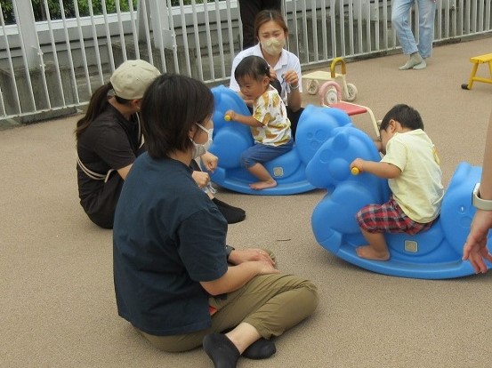 そのあと、バスに乗って、『がんばりまめの杜』へ向かいました。「わー!いっぱい楽しそうなのある♪」と遊具に大喜び!親子でたくさん体を動かしていました!