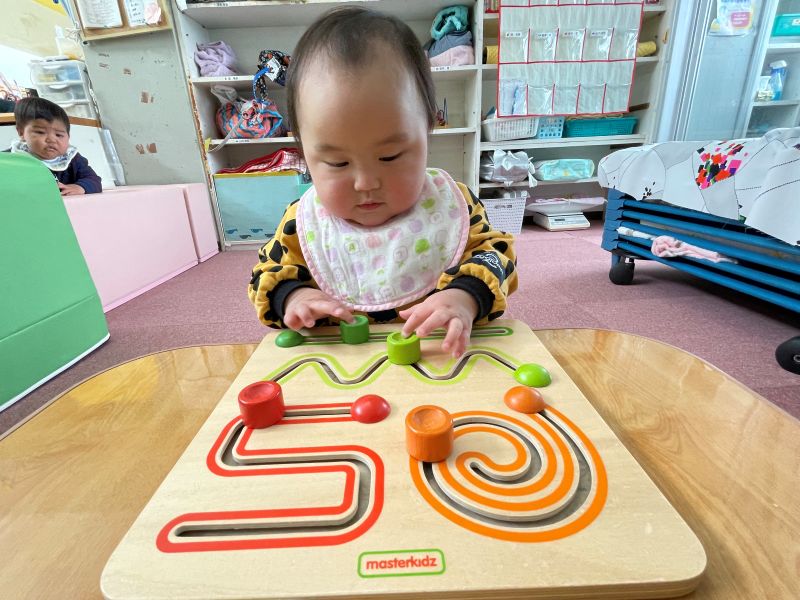 指先でスライドさせながら当てはまる場所を探したり、つまみに手を添えると、横やじぐざぐに動くスライドボードに夢中です。