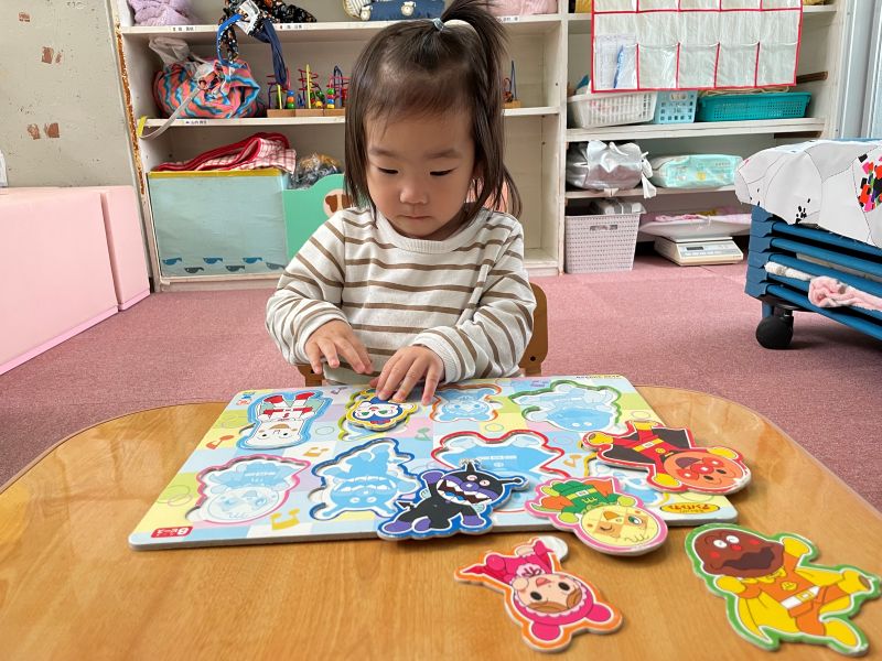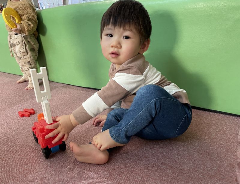 簡単な乗り物の名前や物が一致し、保育者が見立てたものを「うーかんかん!」と、サイレンの真似しながら走らせてみようとする姿がとても微笑ましいです。