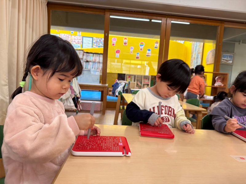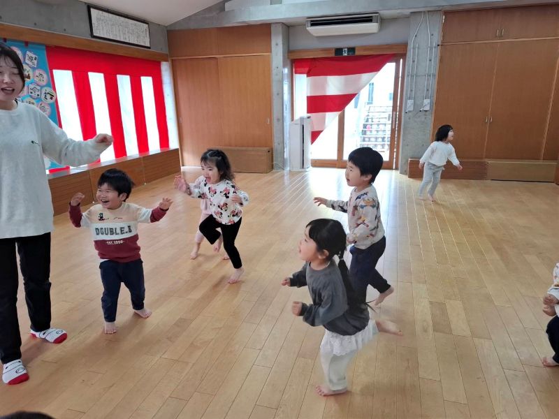 広いホールでのびのびと動物のマネっこをしたり、桃組さんのお部屋に行きおもちゃで遊んでいます!